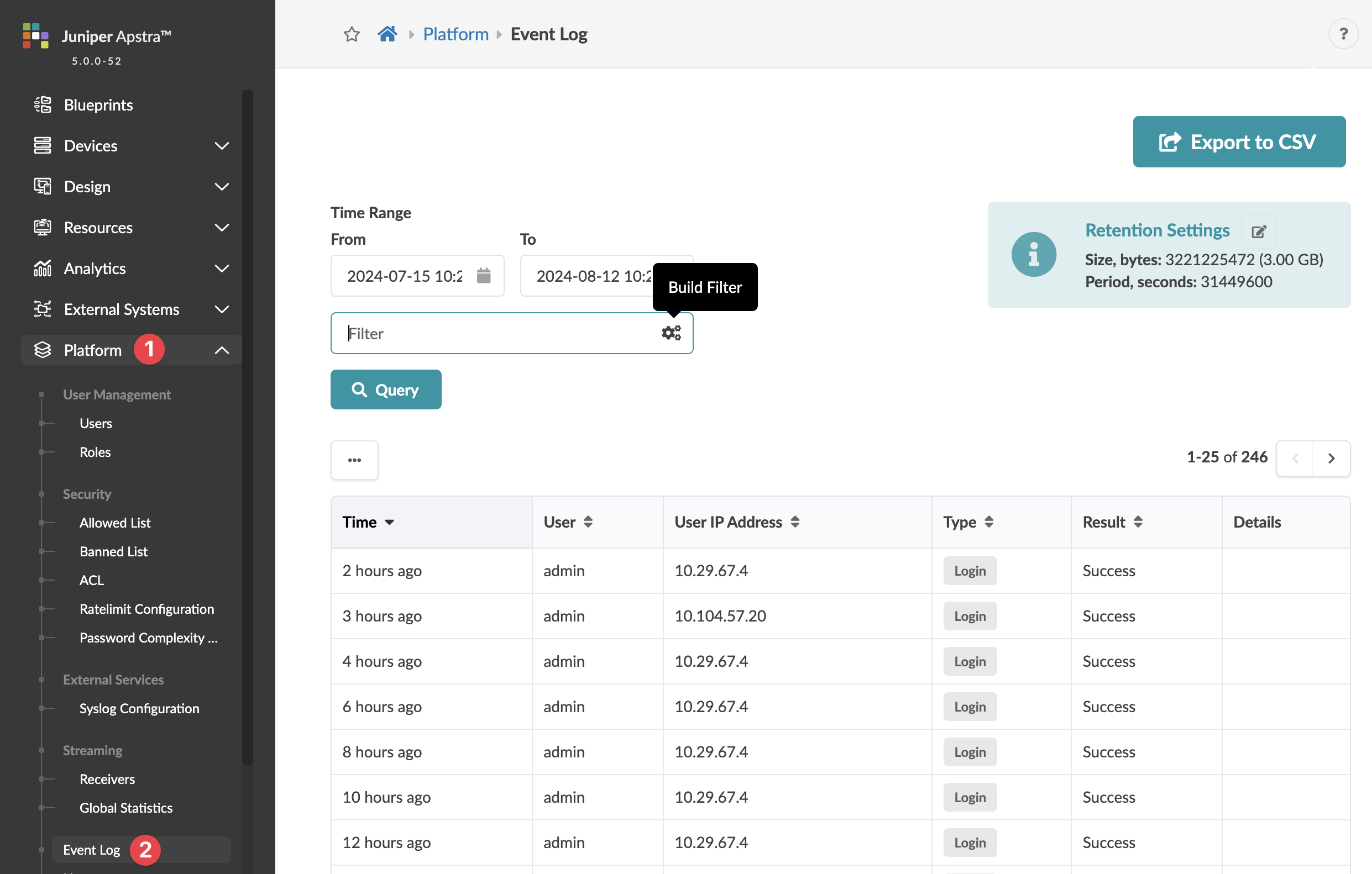 - From the left navigation menu, navigate to Platform > Event Log and click Export to CSV (top-right).