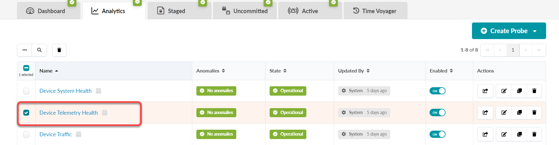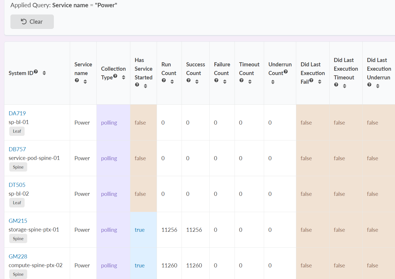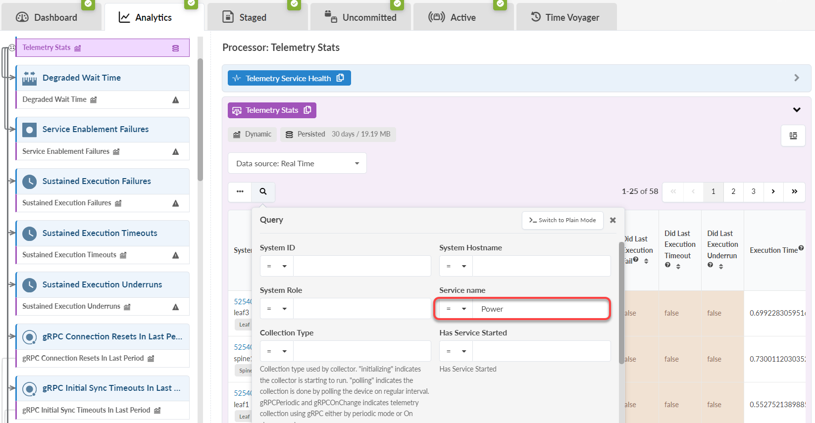 Consider device load when creating custom telemetry collections. Telemetry services could overload your devices based on the CLI show commands and collected data. Short intervals for collector execution can also impact impacting traffic forwarding. By default, Apstra provides an IBA telemetry health probe to monitor service health, including customer services and collectors.