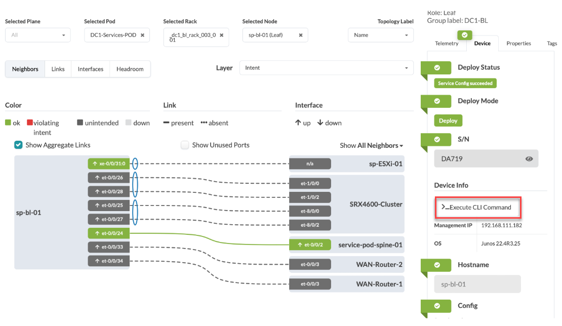 In Apstra, you can run CLI show commands for Junos devices directly from the