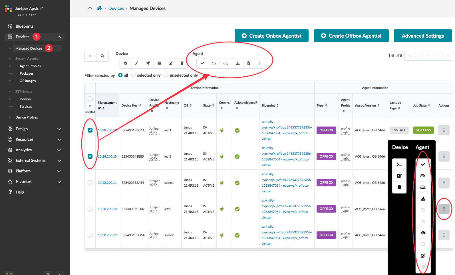 Device system agents handle configuration management, device-to-server communication, and telemetry collection. If you're not using ZTP to bootstrap your devices (or if you have a one-off installation or are using a compute agent) you can use this device installer to automatically install and verify devices. Depending on the device NOS (or OS if it's a compute agent), you can install device agents on-box (agent is installed on the device) or off-box (agent is installed on the server and communicates with devices via API). To find out which platforms support onbox and offbox agents, see the Device Management section of the 6.1.0 Juniper Apstra Feature Matrix.