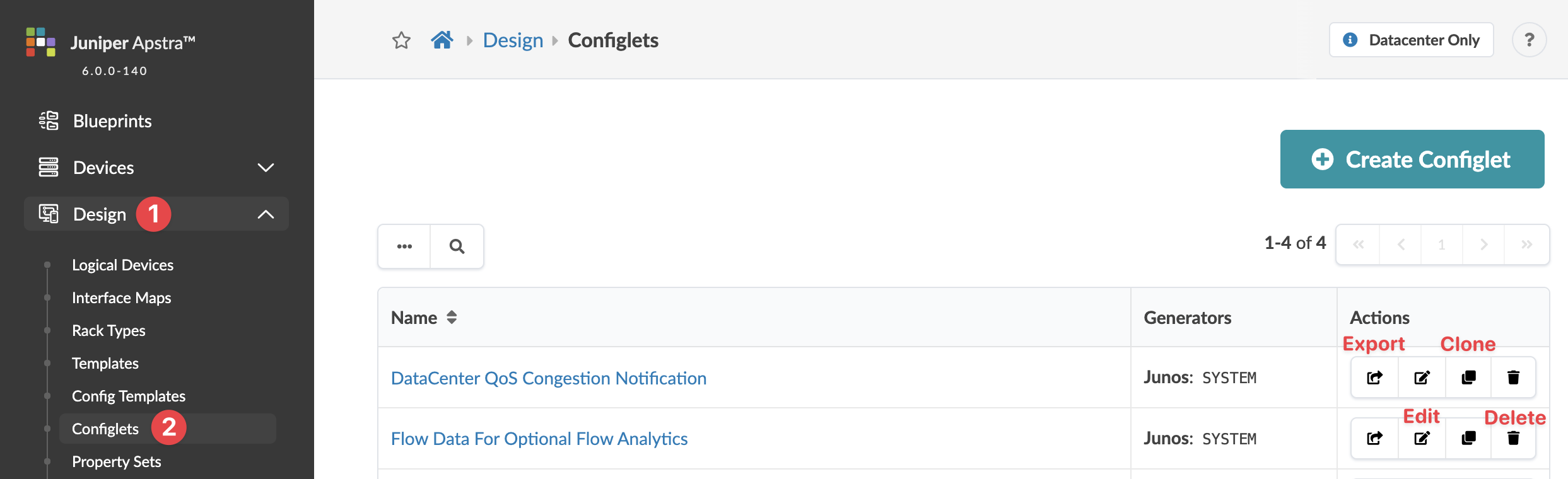 From the left navigation menu of the GUI, navigate to Design > Configlets to go to the Configlets table view.