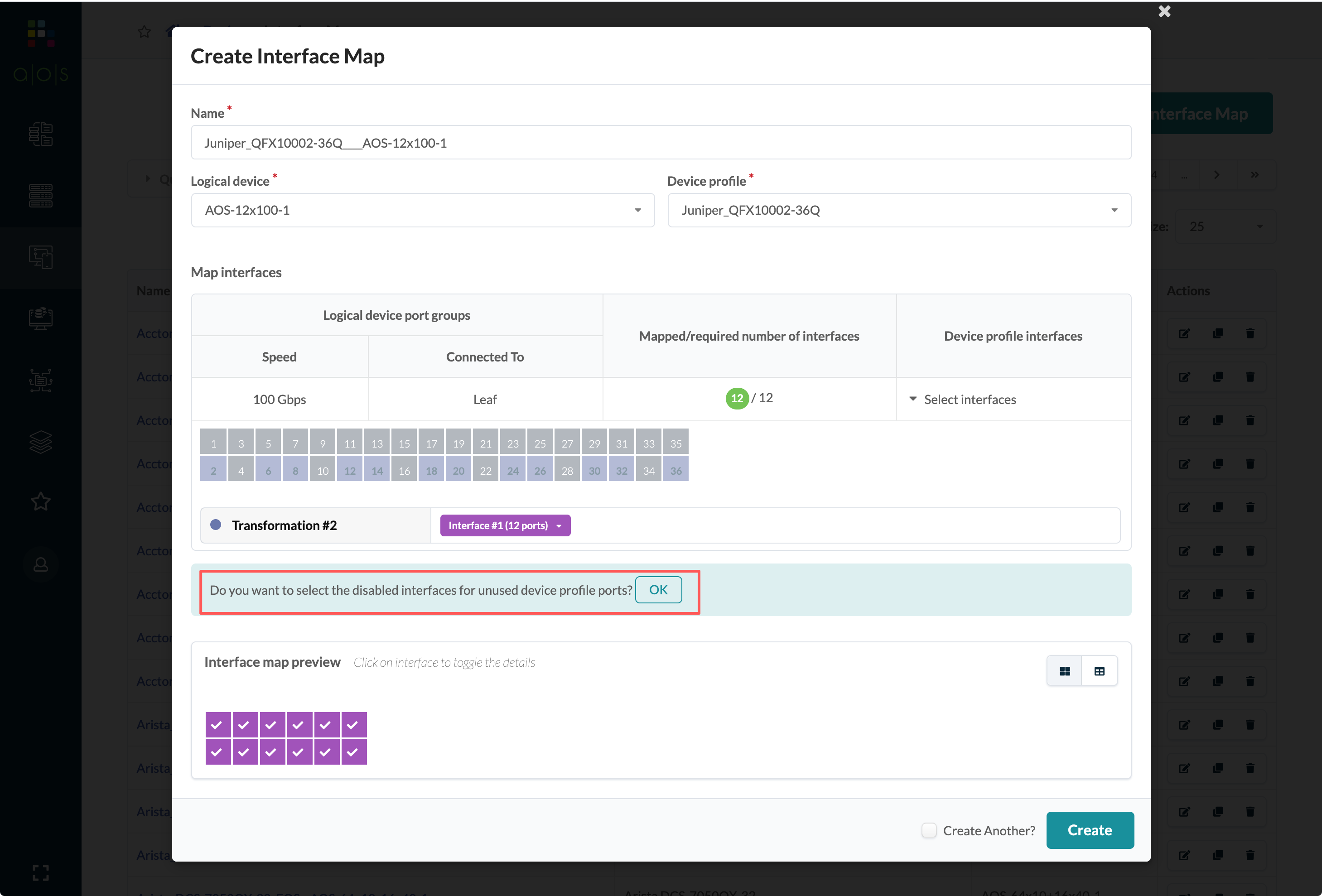 When you select the 100G ports while you're creating the interface map for QFX10002, you are asked if you want to select the disabled interfaces for unused device profile ports. For 100G ports on the QFX10002, click OK so the unused QSFP ports are disabled and can't be used.