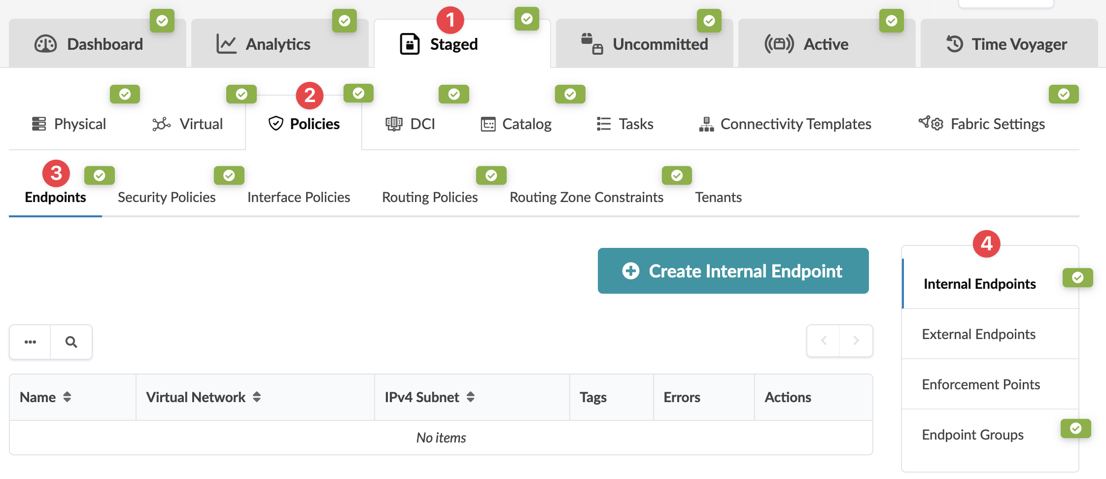 When you want more granularity in your security policies than virtual networks and routing zones can provide, you'll use endpoints. Endpoints can be internal or external to the fabric. You can also combine endpoints into groups.