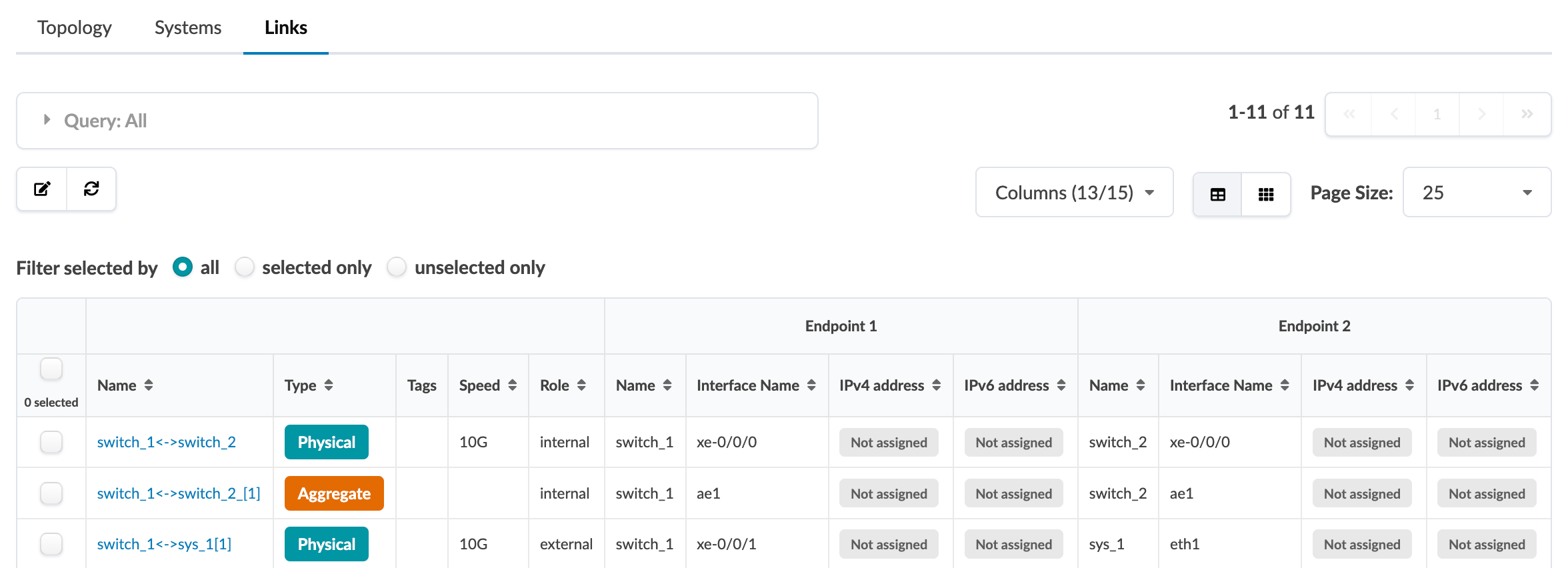 The Links view (Staged > Physical > Links) shows all the links that connect your devices together. The table includes information about endpoint names, link type, tags, speed, role, interface names and IP addresses. You can customize what appears in the table by selecting/deselecting elements in the columns drop-down list. You can perform various tasks from the Links view as described in later sections.