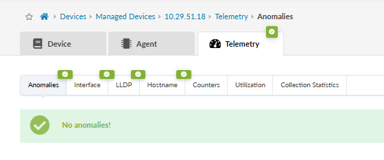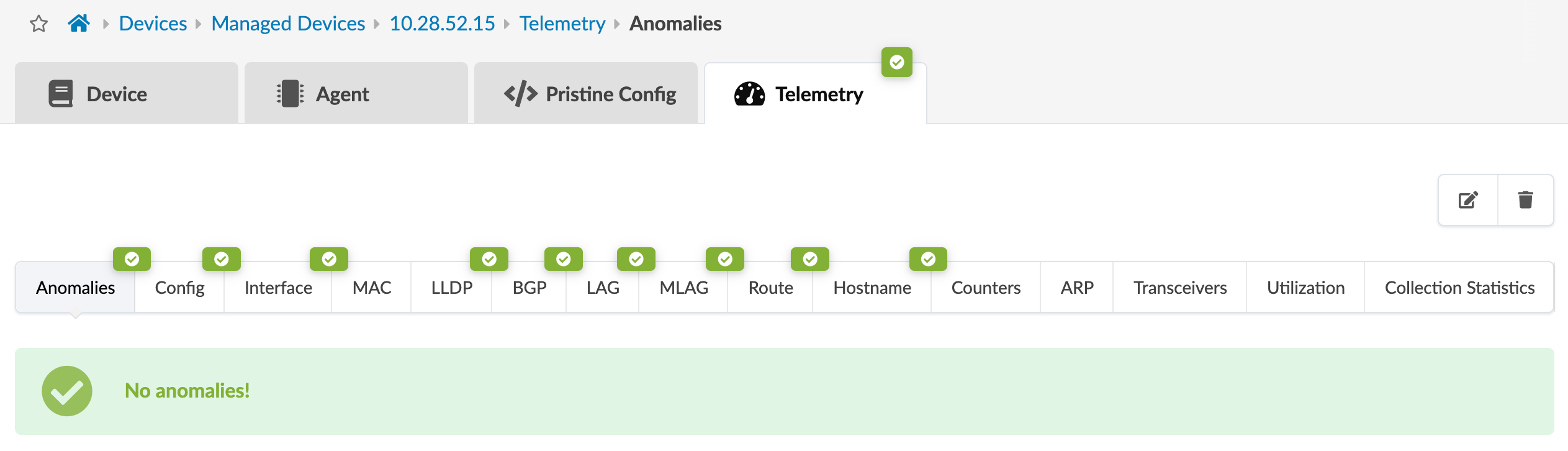 Click a management IP to go to details for its device, agent, pristine config and telemetry as shown below.