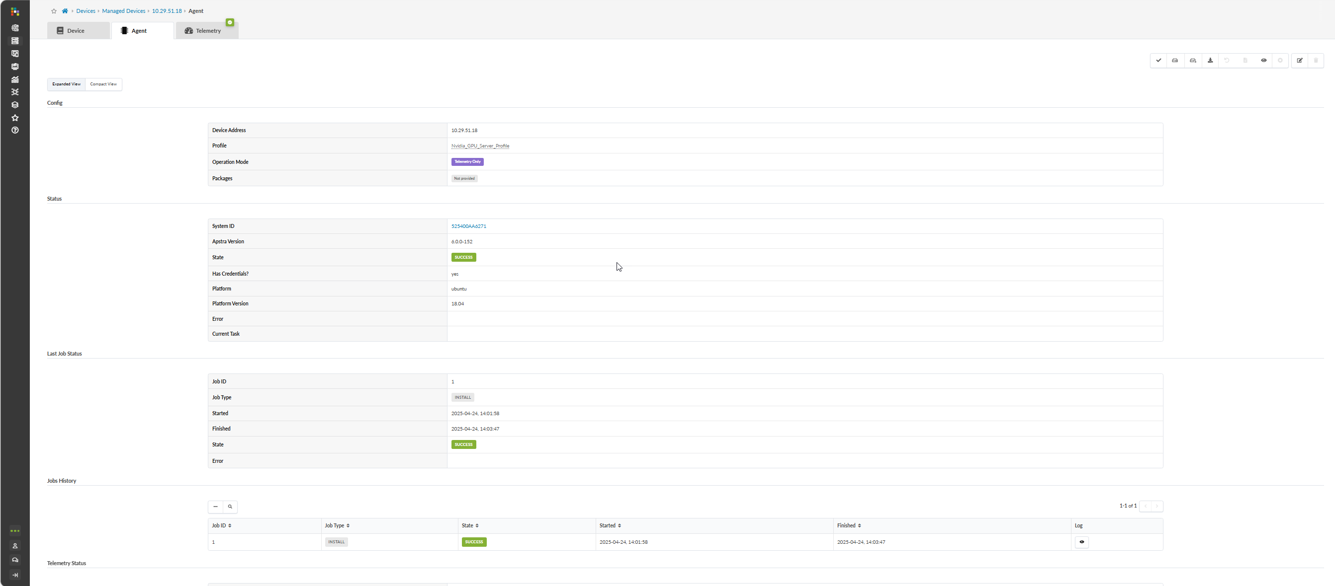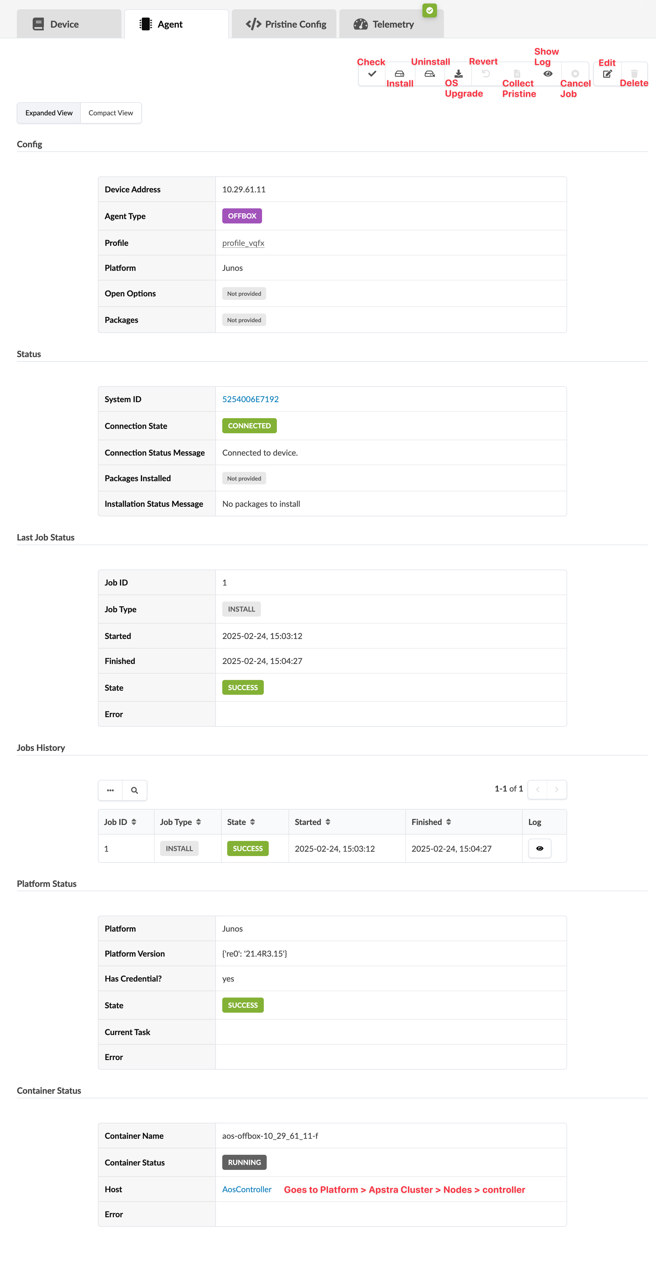 The device agent view shows the agent config, agent status, last job status, jobs history and telemetry status. From the agent detail page you can perform various tasks similar to tasks in the table view. For example, you can restore a device's pristine configuration by clicking the Revert to Pristine Config button (as of Apstra version 4.0.1) as long as the device is not assigned to a blueprint.