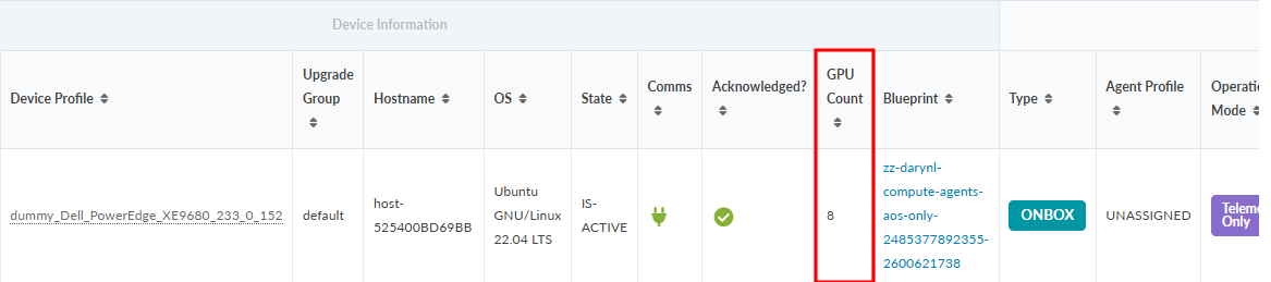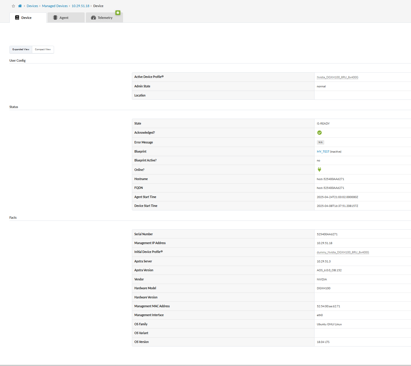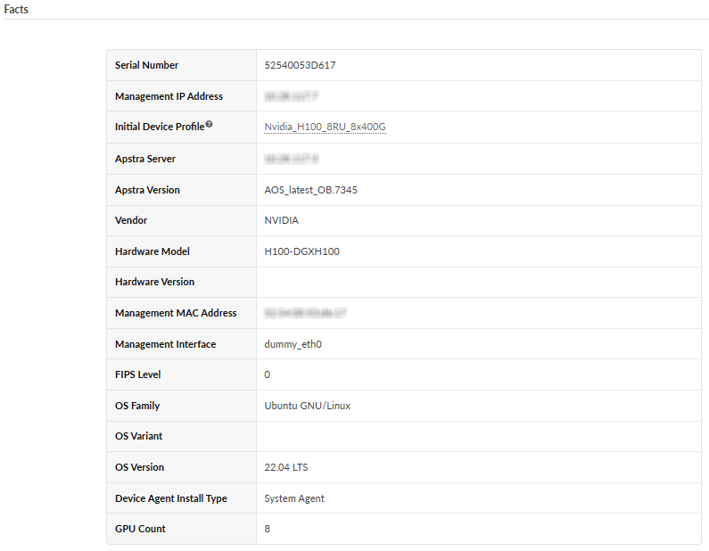 Apstra 6.1 now shows which managed devices contain GPUs, how many GPUs are present in a device, and vendor information. 6.1 displays GPU details in managed device details for GPU hosts.