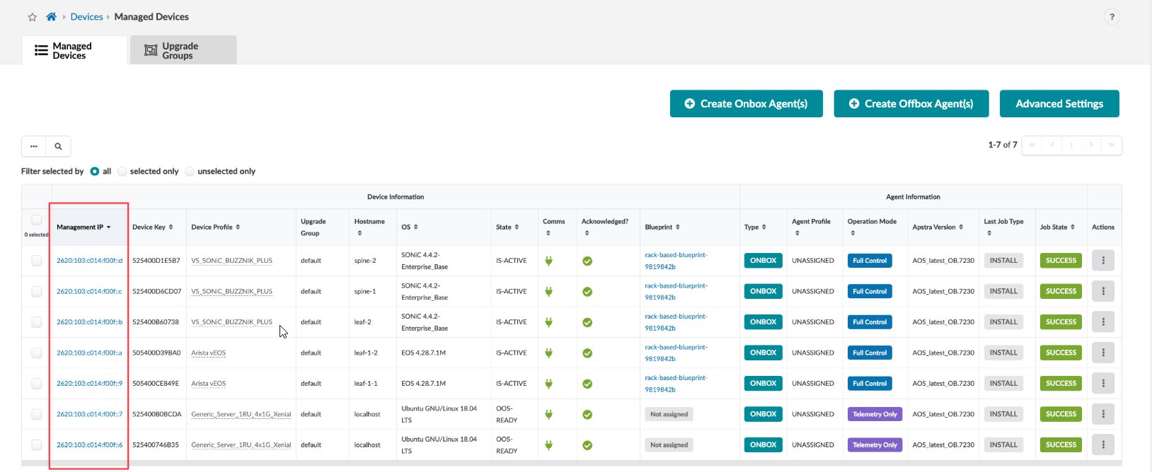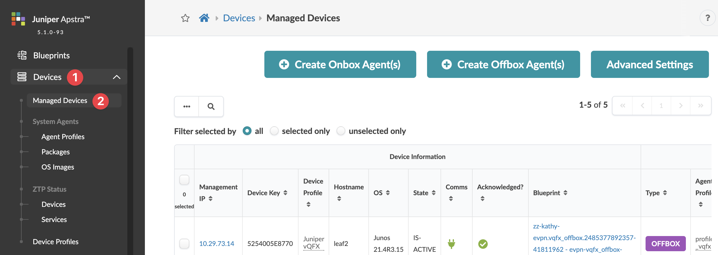 From the left navigation menu in the Apstra GUI, navigate to Devices > Managed Devices to go to the table of those devices with installed agents.