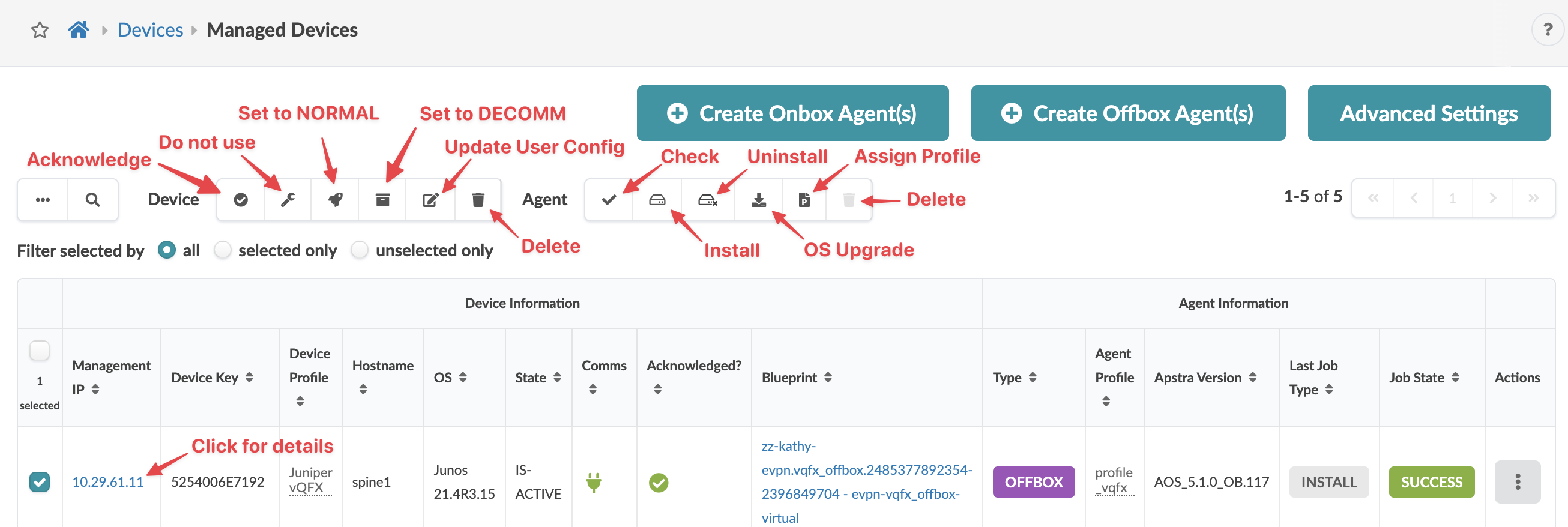Apstra device system agents handle configuration management, device-to-server communication, and telemetry collection. If you're not using Apstra ZTP to bootstrap your devices (or if you have a one-off installation) you can use this device installer to automatically install and verify devices. Depending on the device NOS, you can install device agents onbox (agent is installed on the device) or offbox (agent is installed on the Apstra server and communicates with devices via API). For support information, see the Device Management section of the Apstra 5.1.0 Feature Matrix.