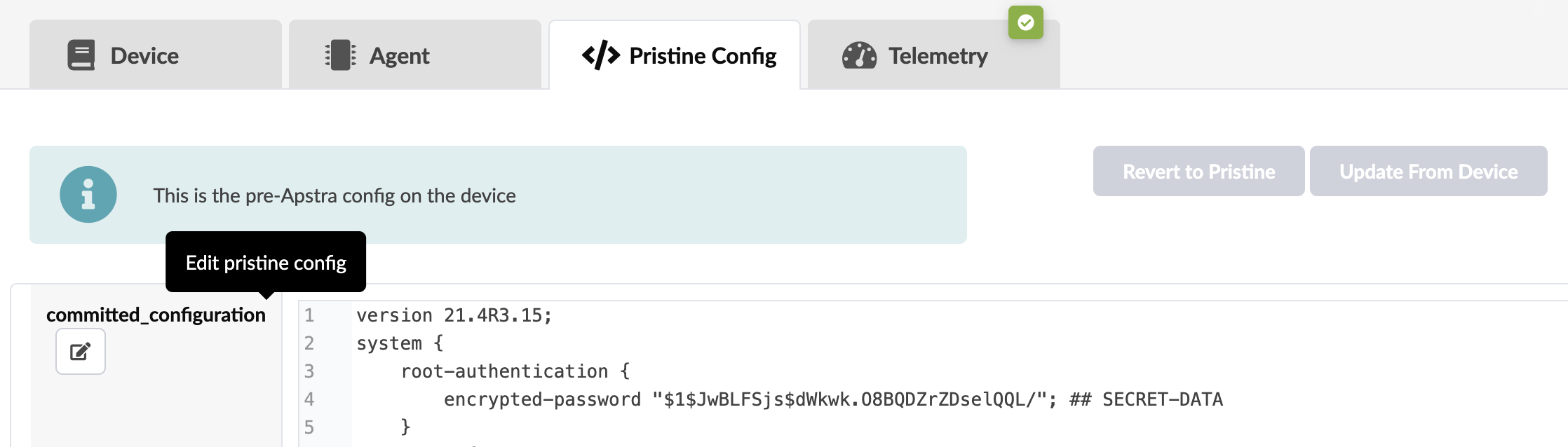 The pristine config view shows the pre-Apstra configuration on the device. You can edit the pristine config manually or update it directly from the device. You can edit and delete the device. You can also edit or delete the device from the table view or any of the other detail views (Device, Agent, Telemetry).