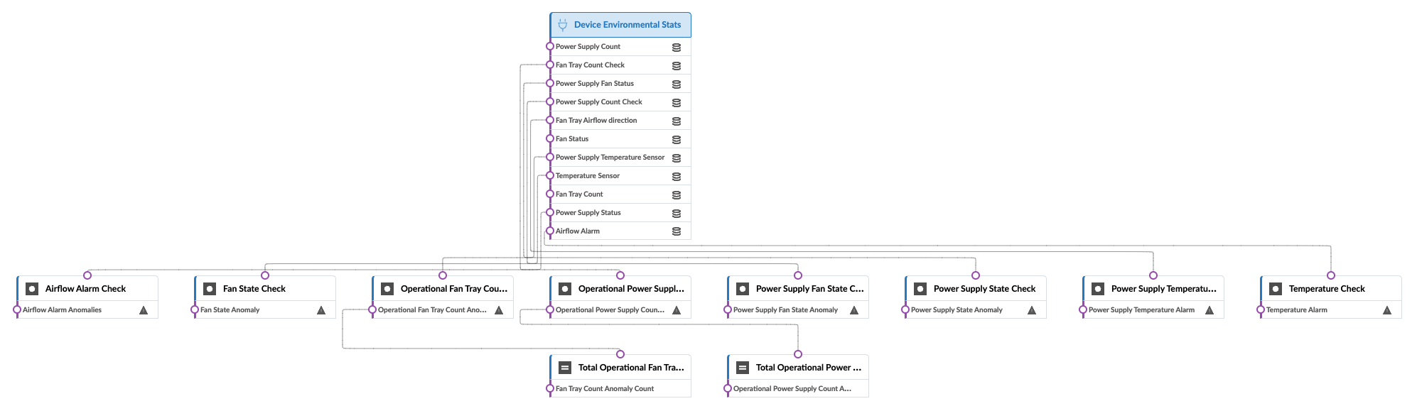 The device environmental checks probe monitors critical environmental metrics for managed switches including power supply, fan and temperature for real-time values of historical data retention over time.