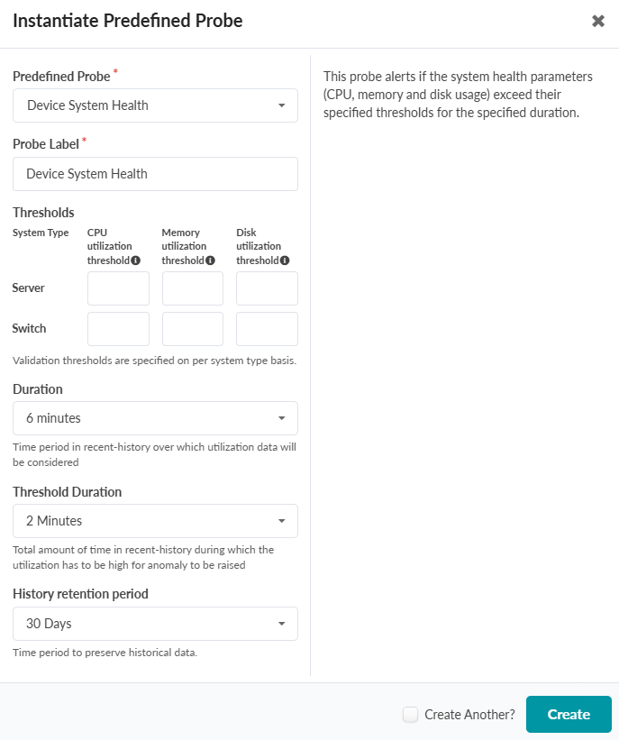 The Device Dystem Health probe alerts if the system health parameters (CPU, memory and disk usage) exceed their specified thresholds for the specified duration.