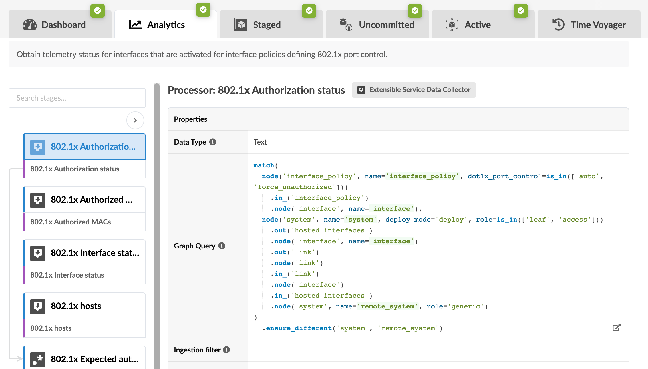 The Interface Policy predefined probe is used to monitor 802.1X supplicants and interface authentication. You can instantiate this probe to maintain 802.1X networks. The 802.1X hosts probe gives a fast view of network 802.1X MAC addresses, authorization status, ports, and dynamic VLAN information.