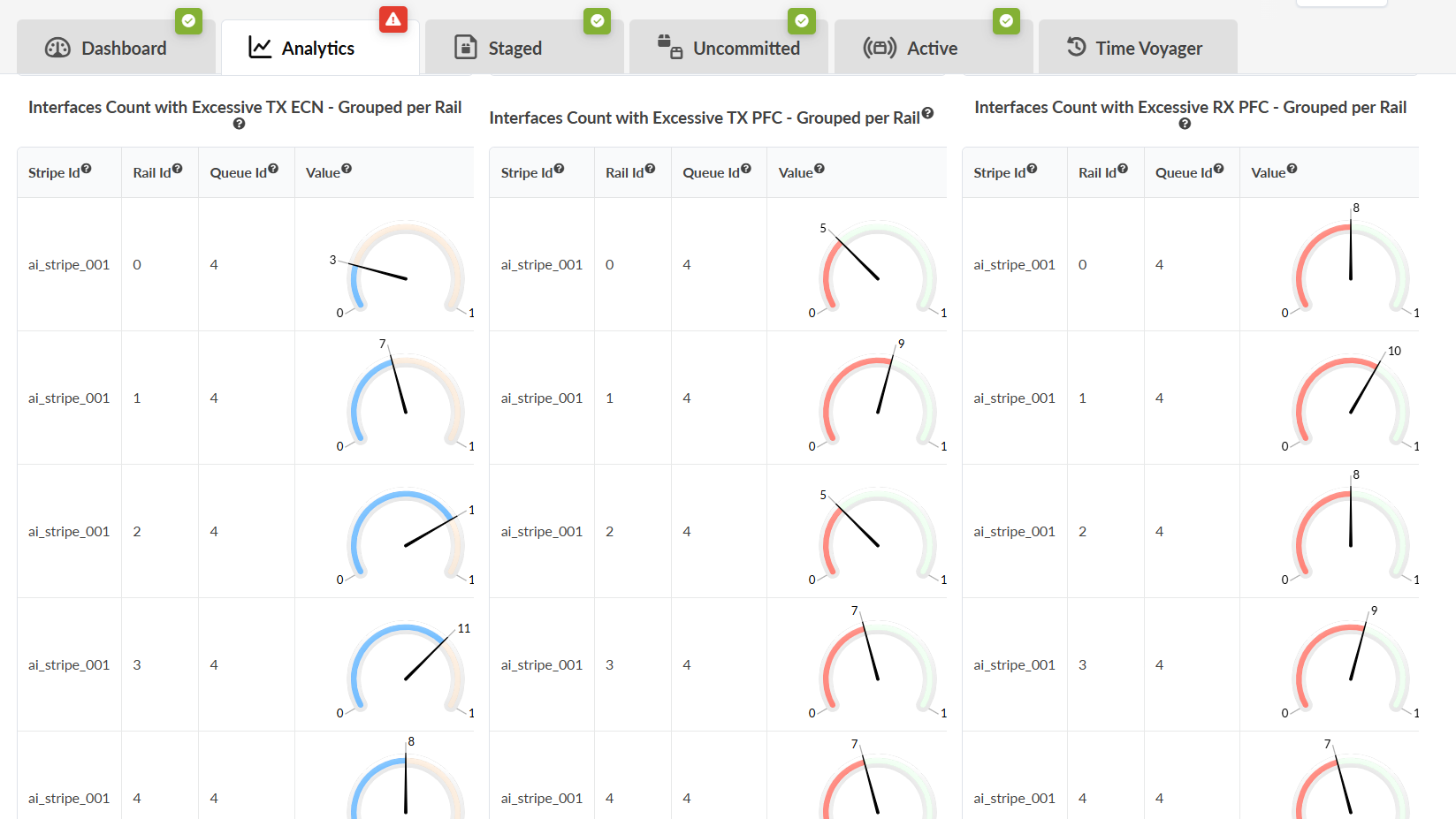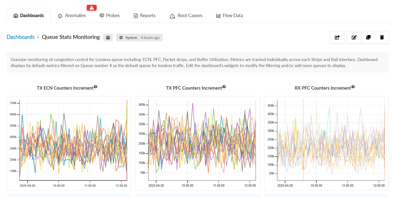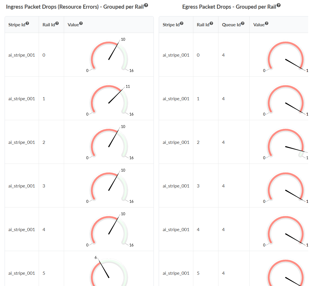 The Interface Queue Stats Monitoring Probe collects and reports metrics like transmitted Explicit Congestion Notification (ECN) packets, Priority Flow Control (PFC) signals, buffer utilization, and packet drop ratio, on a per-interface, per-queue basis. These metrics are crucial for verifying that the AI fabric is delivering lossless Ethernet in production.