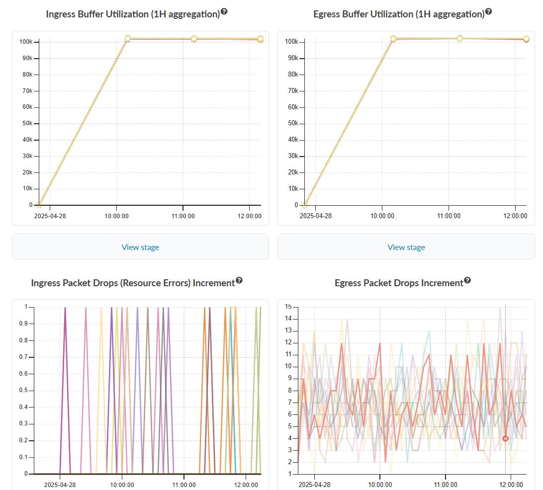 - Buffer utilization: How "full" a network device's packet buffer queue is at any given time. High buffer utilization typically signals potential congestion or microbursts.