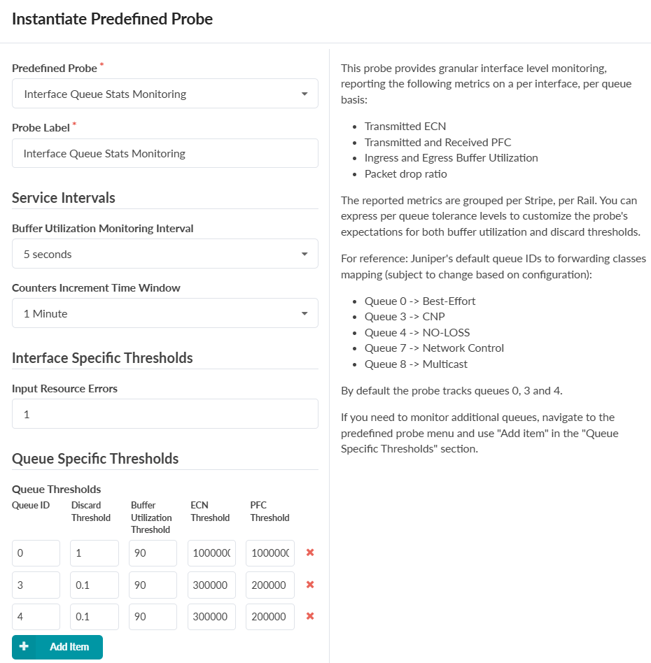Version 6.0 introduces a predefined probe, called the Interface Queue Stats Monitoring Probe. The probe is designed for granular interface-level monitoring. The probe collects and monitors interface metrics to determine whether your AI fabric is delivering lossless Ethernet service (lossless packet delivery). Lossless Ethernet is required for an AI fabric using RDMA over Converged Ethernet version 2 (ROCEv2) protocol. The probe is designed to help you verify lossless operation by continuously tracking crucial congestion and loss metrics for the interfaces and queues in the fabric.