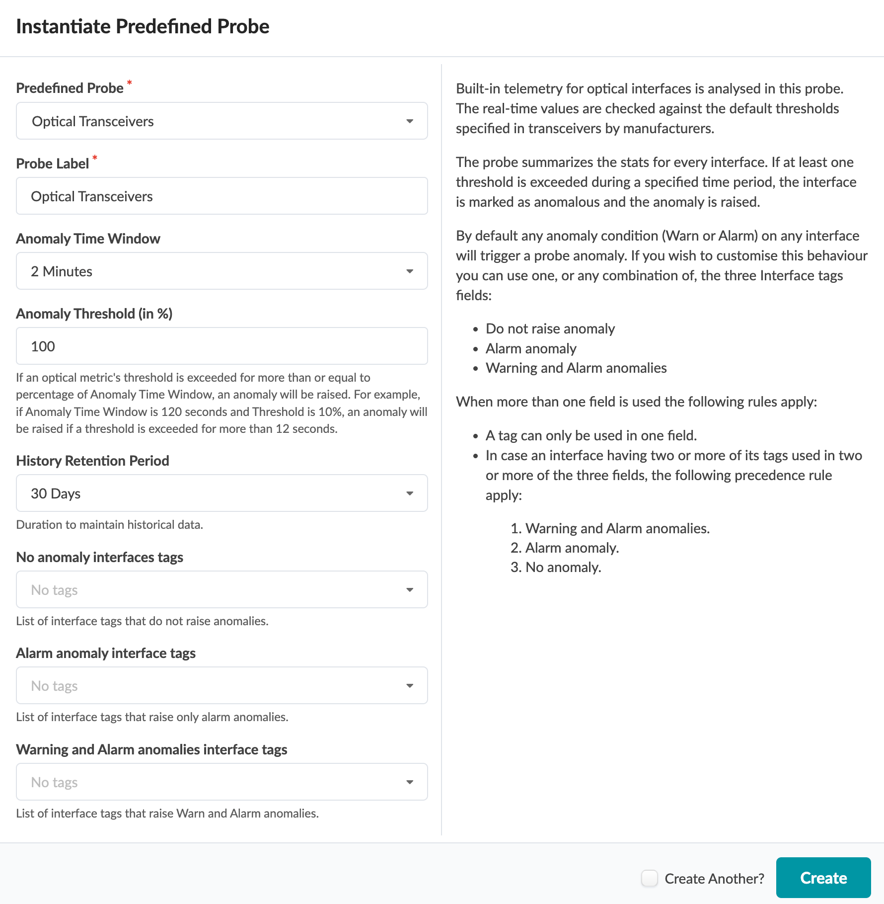 When you instantiate the predefined Optical Transceiver probe you can customize parameters or leave default values as is, as shown in the screenshot below.