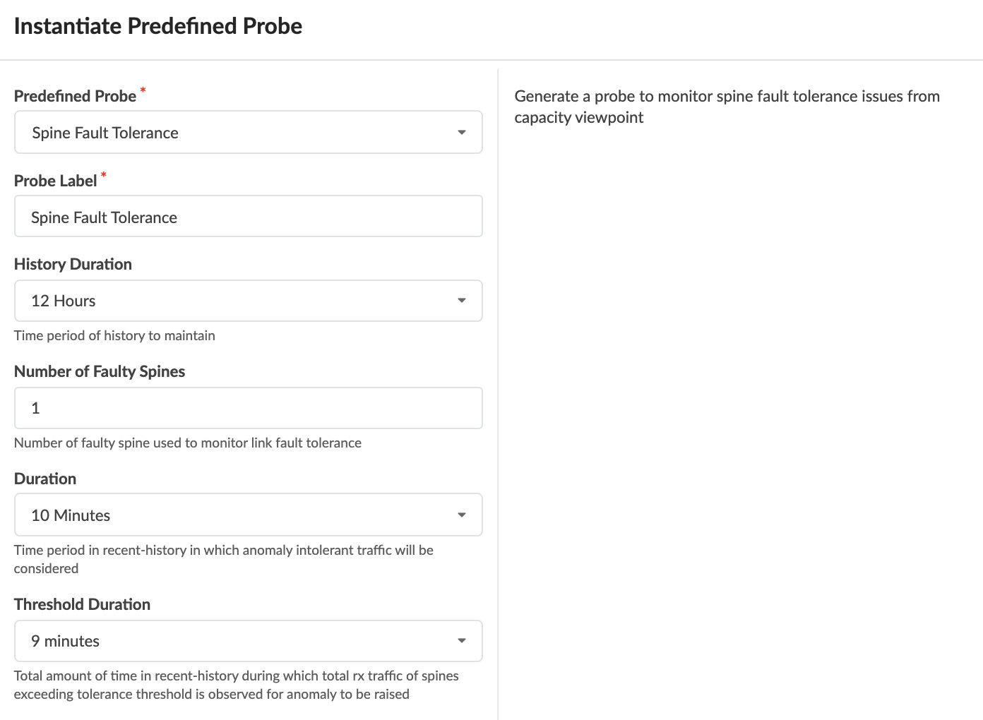The spine fault tolerance probe monitors spine fault tolerance issues from a capacity viewpoint.