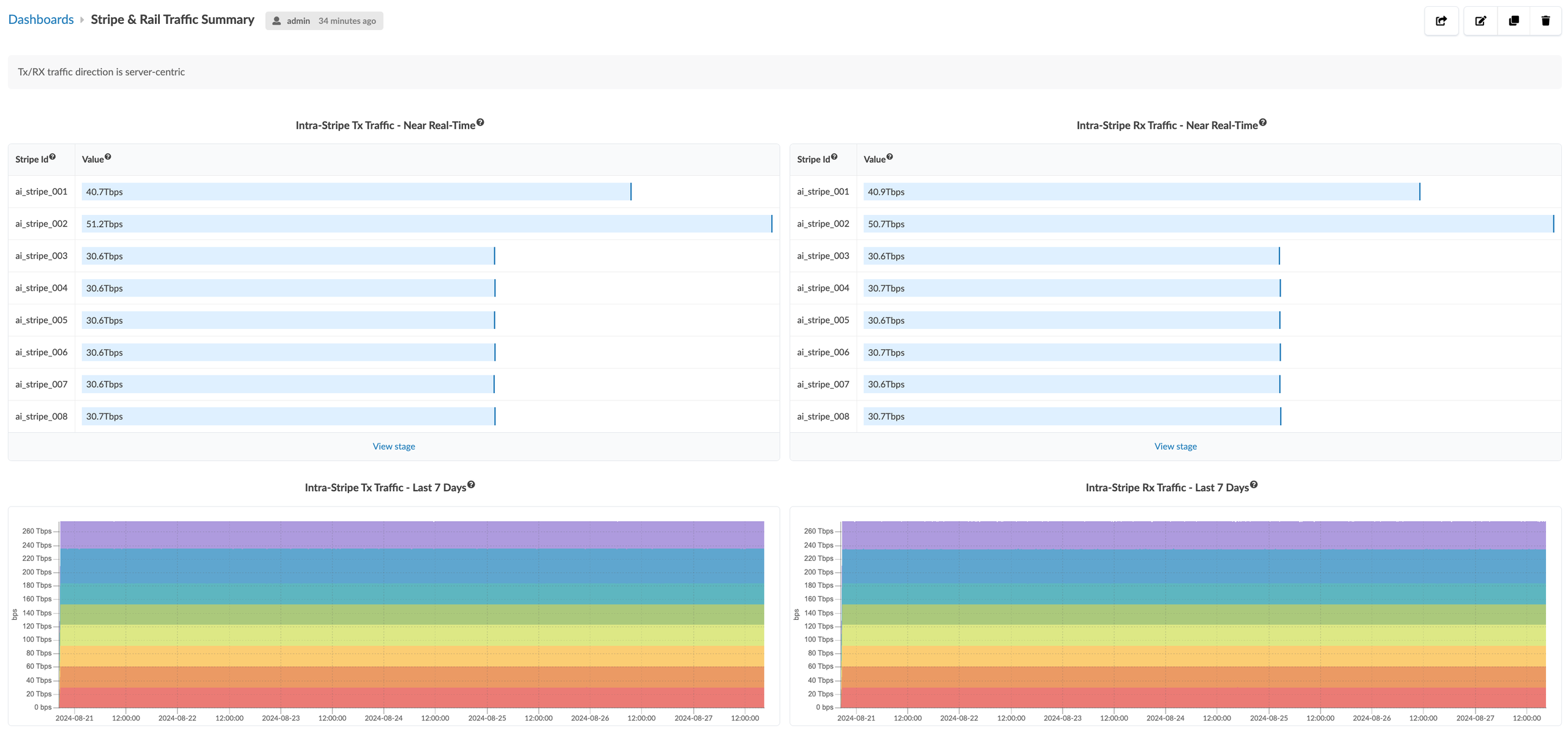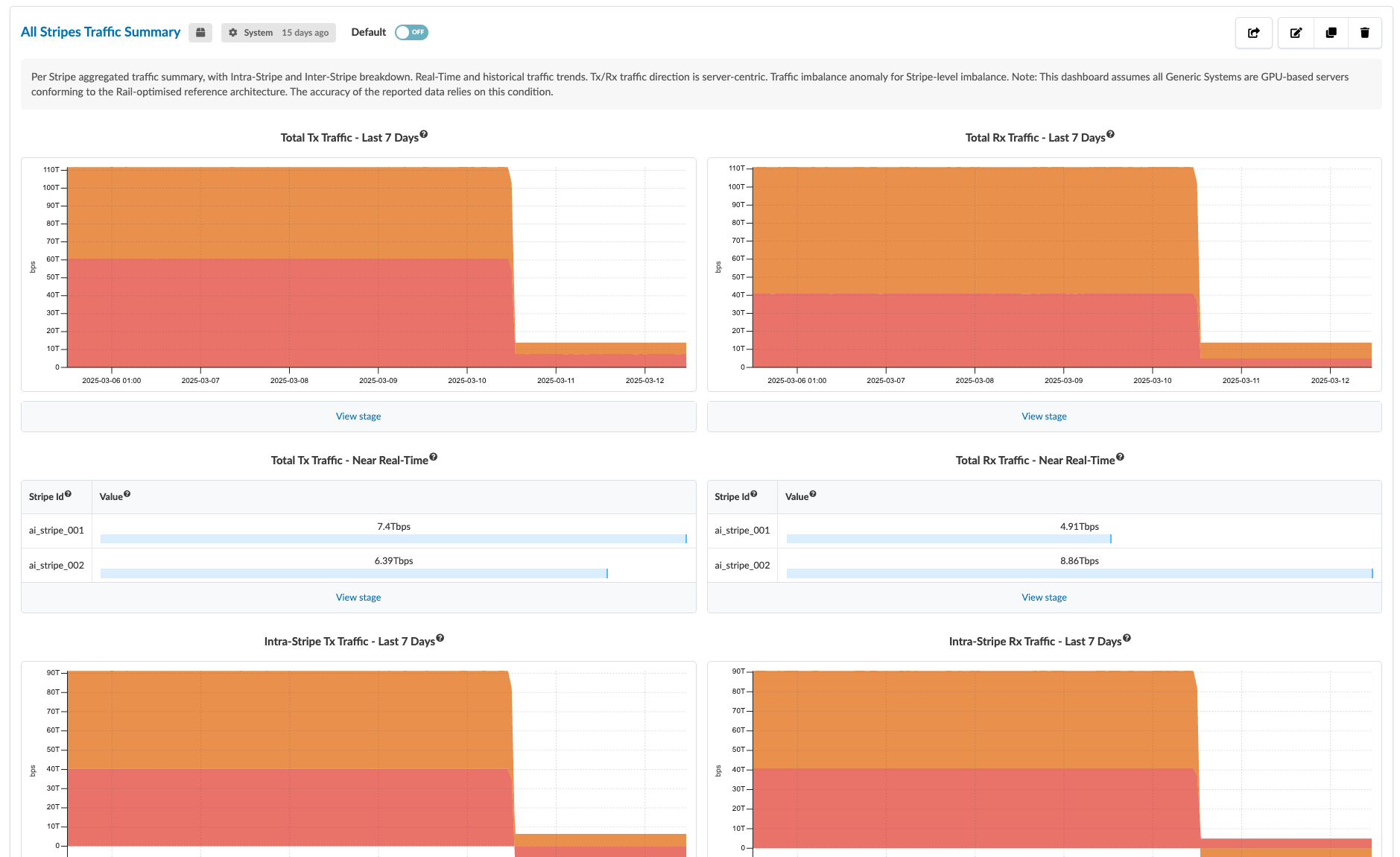 The infrastructure of a GPU Backend fabric makes it ideal for high-demand AI workloads like AI Large Language Model (LLM) training. One of the main goals of a GPU Backend fabric is to provide lossless GPU-to-GPU communication, because this affects the speed and efficiency of AI workload completion. This means that a centralized view of real-time and historical traffic flow data across stripes is essential.