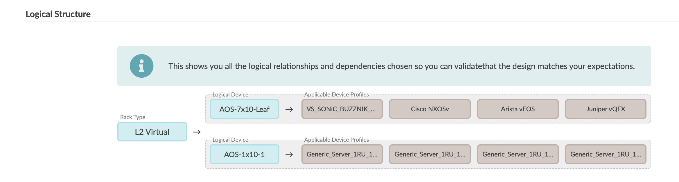 The Logical Structure section is a visual representation of the logical relationships and dependencies in the rack type so you can validate the design against your expectations. The screenshot below is for the predefined rack type named L2 Virtual. It includes two different types of logical devices: one for the leaf with seven 10Gbps ports and the other for the generic systems with one 10Gbps port. Each logical device can use one of several device profiles as shown in the logical structure. Device profiles (hardware models) and logical devices (capabilities of devices) are associated with each other via interface maps. If you created a custom interface map that used one of the logical devices below, it would be added as one of the applicable device profiles below.)