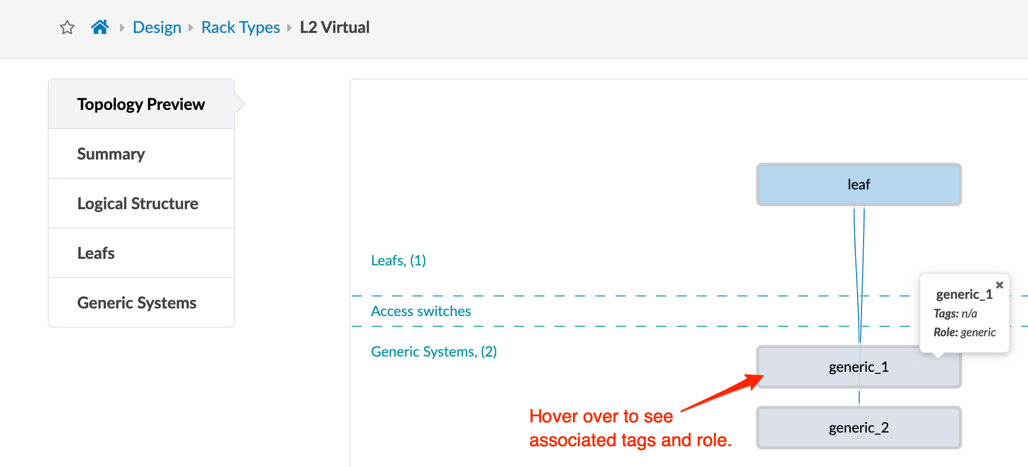 The Topology Preview section shows a visual representation of the logical elements in a rack type. The screenshot below shows the topology preview for the predefined rack type named L2 Virtual. It consists of one leaf device and 2 generic systems. (Generic systems attach compute/storage; they connect to a single rack in the topology.)