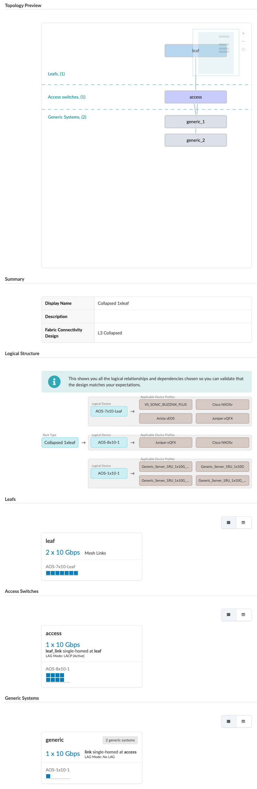 | Rack Type Name | Number and Type of Leafs | Leaf Details | Number of Access Switches | Access Switch Details | Number of Generic Systems | Generic System Details |