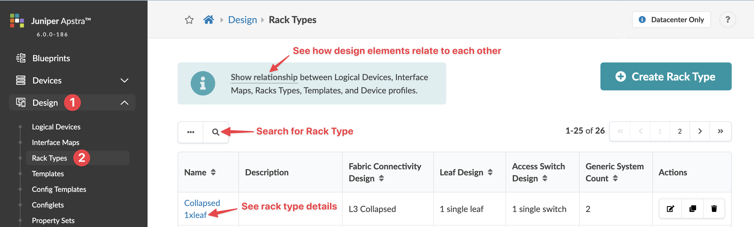 From the left navigation menu, navigate to Design > Rack Types to go to the rack types table in the Design (global) catalog.