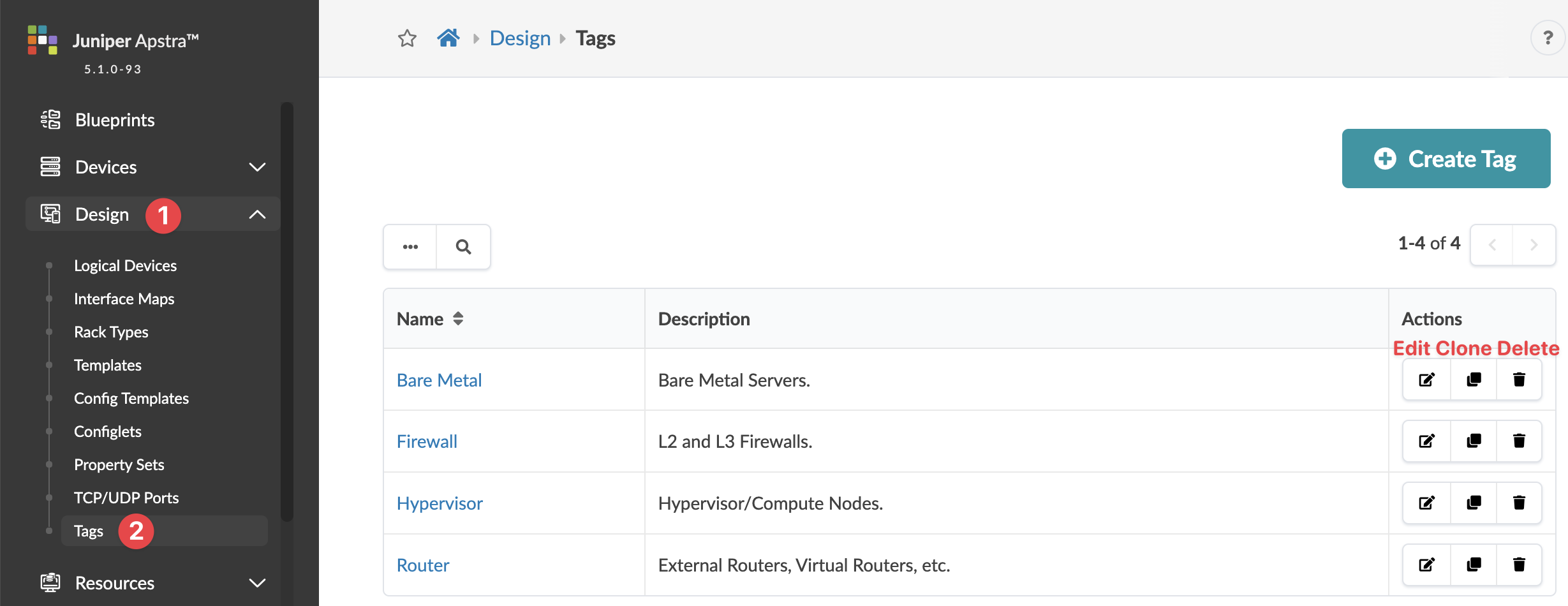 From the left navigation menu, navigate to Design > Tags to go to tags in the global catalog. Four tags (Bare Metal, Firewall, Hypervisor, Router) are predefined for you. You can create, clone, edit and delete tags in the global catalog.
