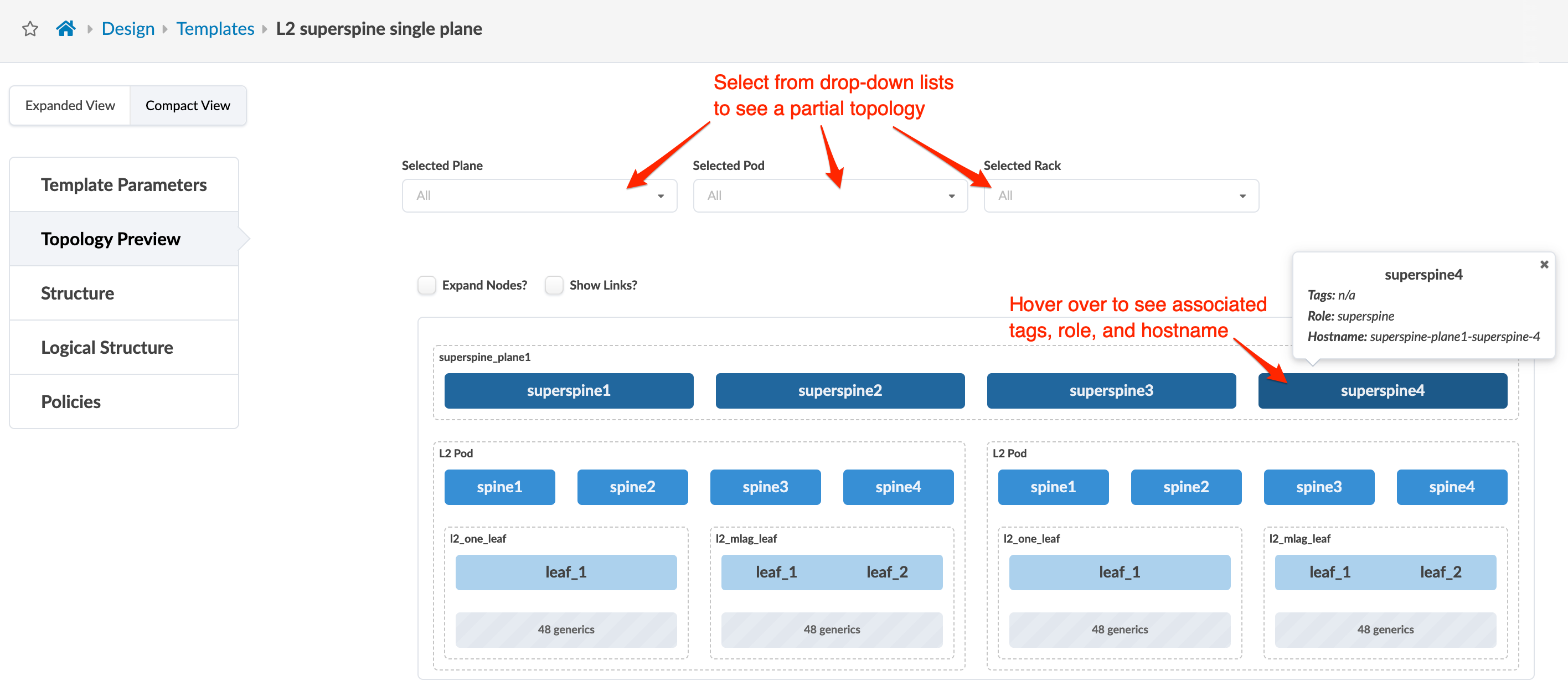 The Logical Structure section consists of a visual representation of the logical elements in the template. It shows the logical relationships and dependencies so you can validate that the design matches your expectations. The screenshot below is for the predefined pod-based rack type named L2 superspine single plane.