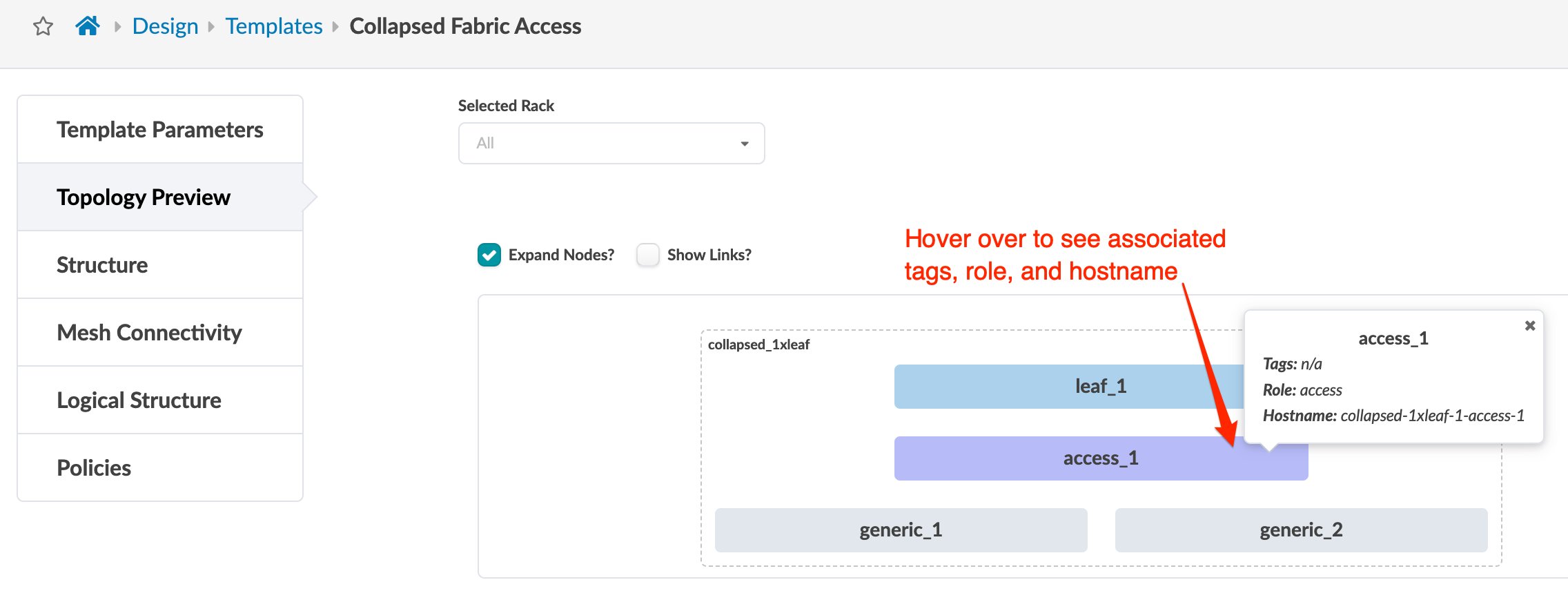 The Logical Structure section consists of a visual representation of the logical elements in the template. It shows the logical relationships and dependencies so you can validate that the design matches your expectations. The screenshot below is for the predefined collapsed rack type named Collapsed Fabric Access.