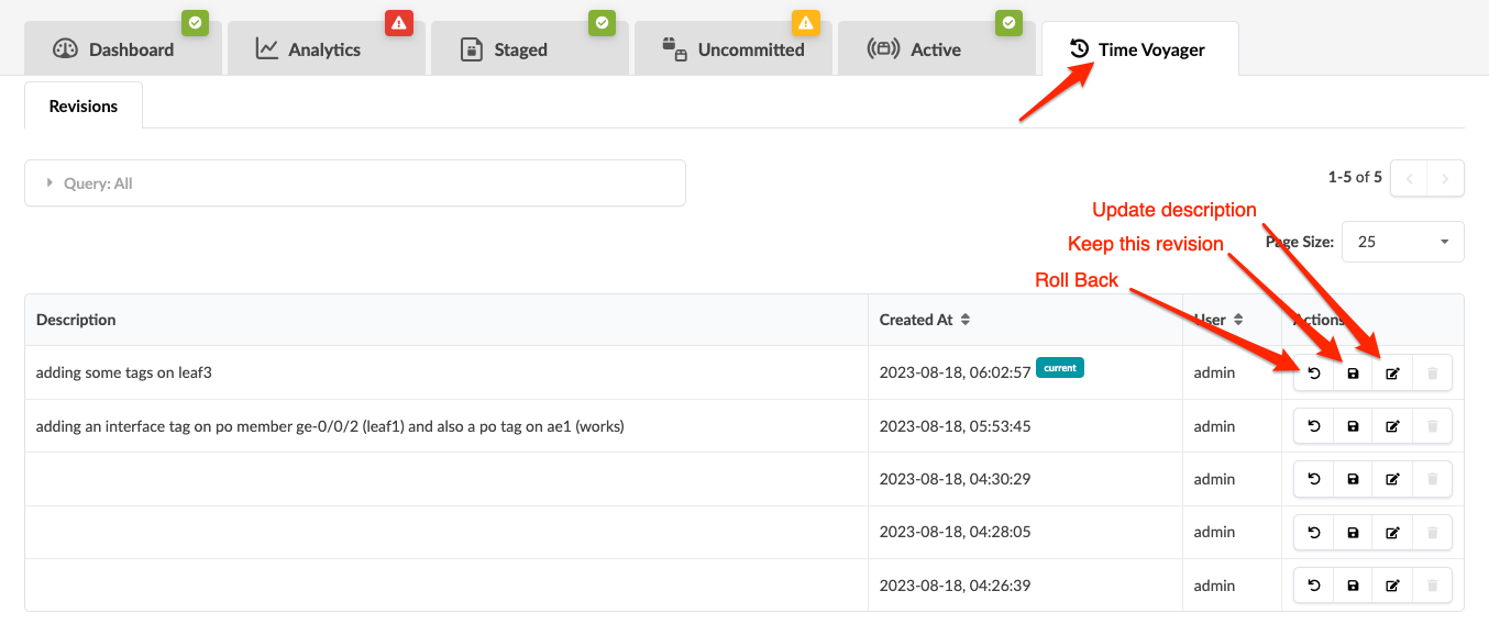 Why not use Apstra server backup/restore to jump to a previous revision? Time Voyager maintains synchronized configuration between the Apstra server and devices (as much as possible); Apstra backup/restore does not. Effectively, the Apstra backup/restore is an out-of-band change from a device configuration standpoint. If a backup is restored, you would need to push a full config to make sure the device configuration reflects what you restored from the database backup. This would most likely be disruptive.