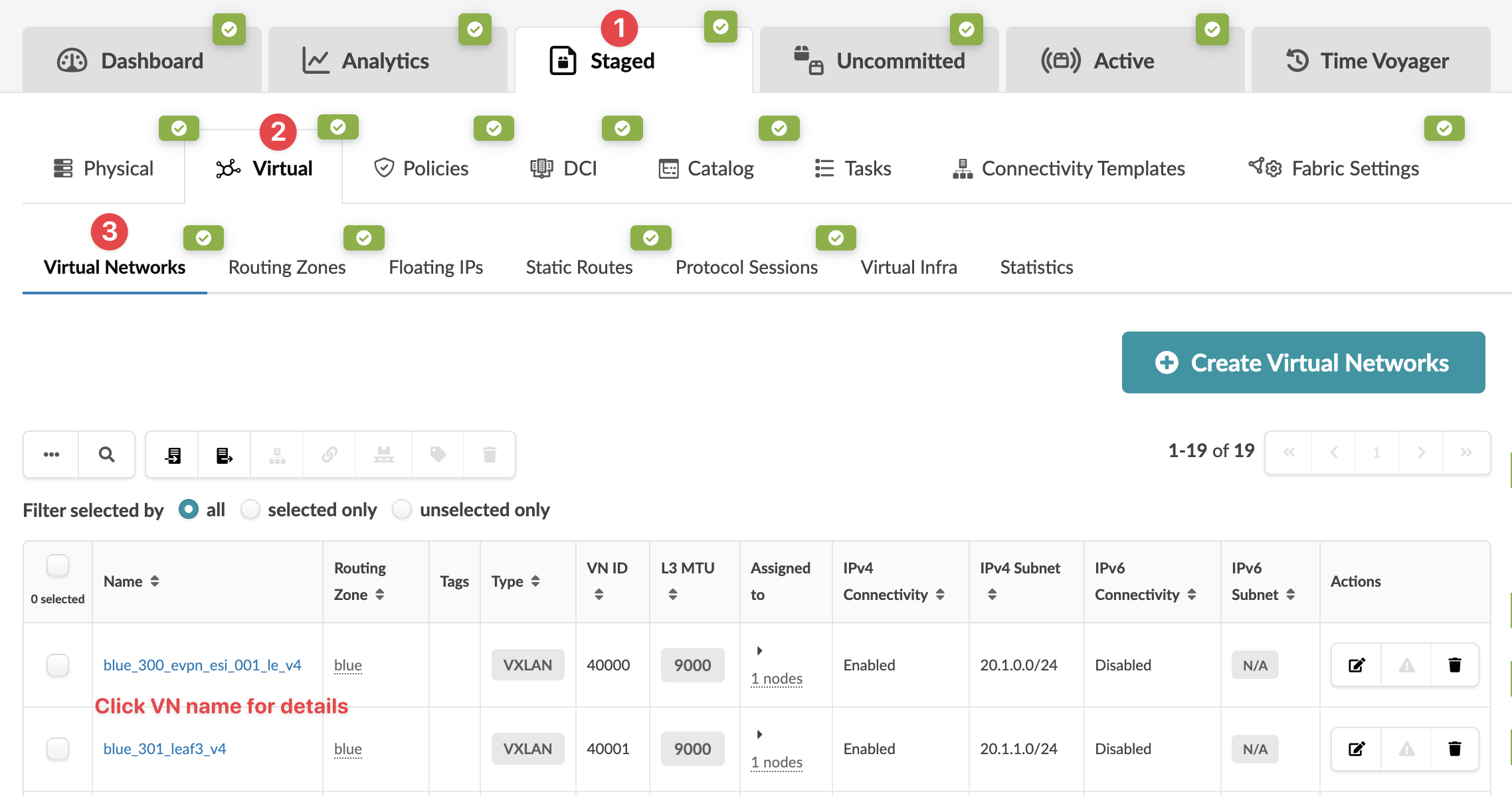 From the blueprint, navigate to Staged > Virtual > Virtual Networks to go to the Virtual Networks table view.