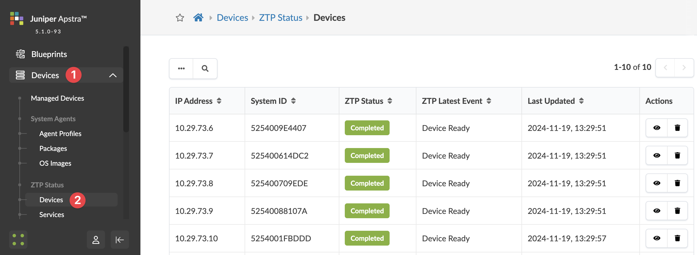 When the ZTP process successfully onboards a device it's included in the Managed Devices page, ready to be acknowledged and assigned to a blueprint. Navigate to Devices > Managed Devices to see available devices.