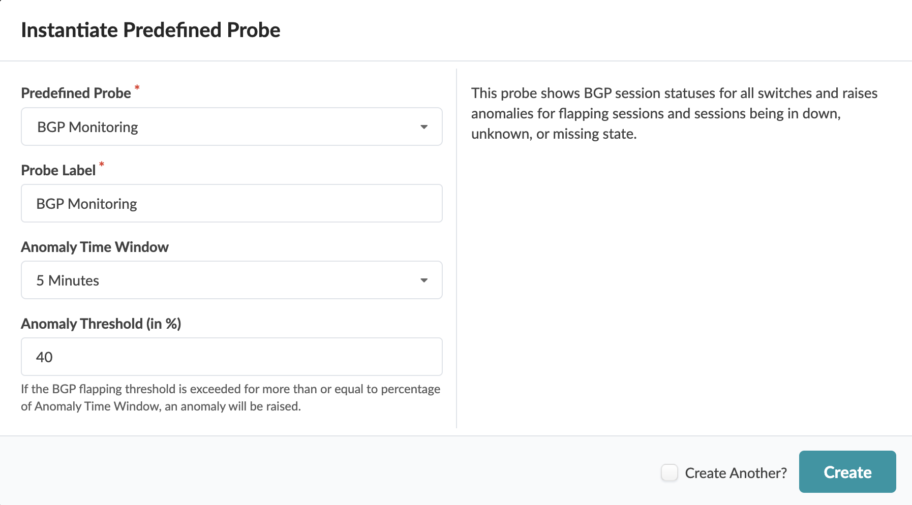 This probe is supported on Junos OS, Junos OS EVO, Arista EOS, Cisco NX-OS and SONiC). The BGP Monitoring probe shows BGP session status for all switches and raises anomalies for flapping BGP sessions. In Freeform blueprints, the probe also monitors and raises anomalies when BGP sessions are down, missing or unknown. (In Datacenter blueprints, BGP session up and down state is included with built-in telemetry, so it's not required in this probe.)