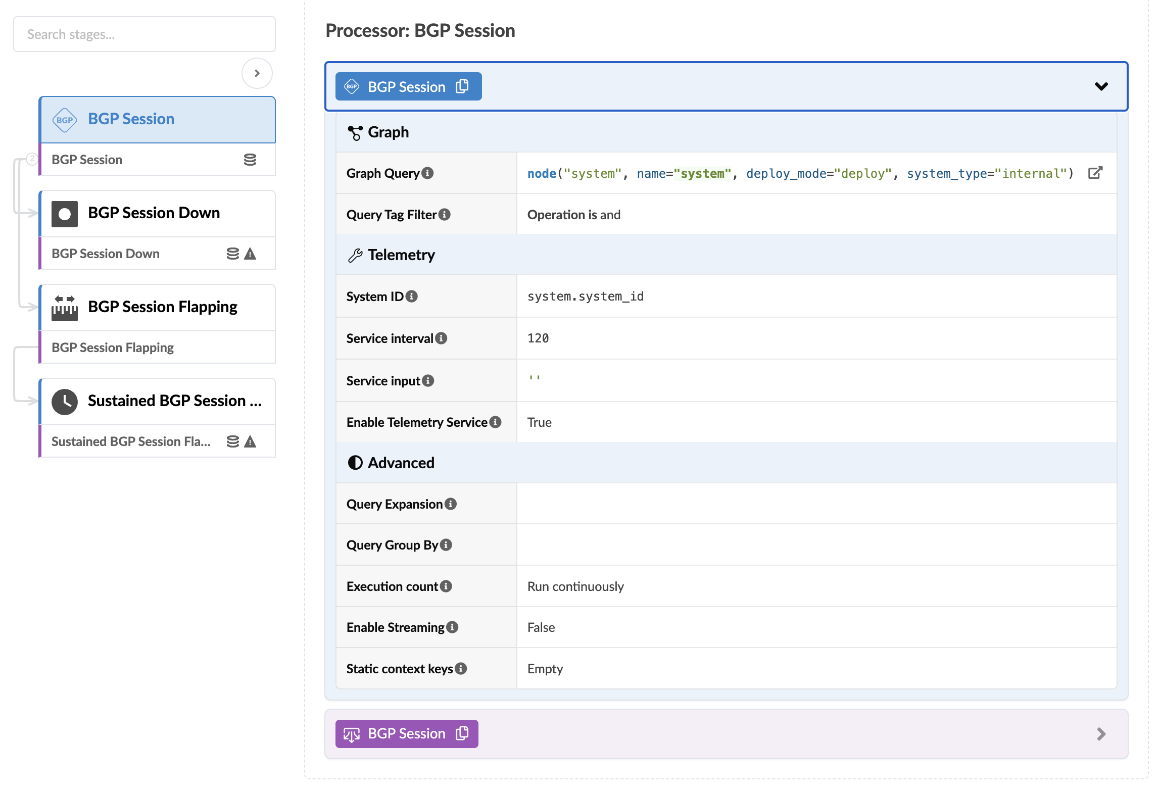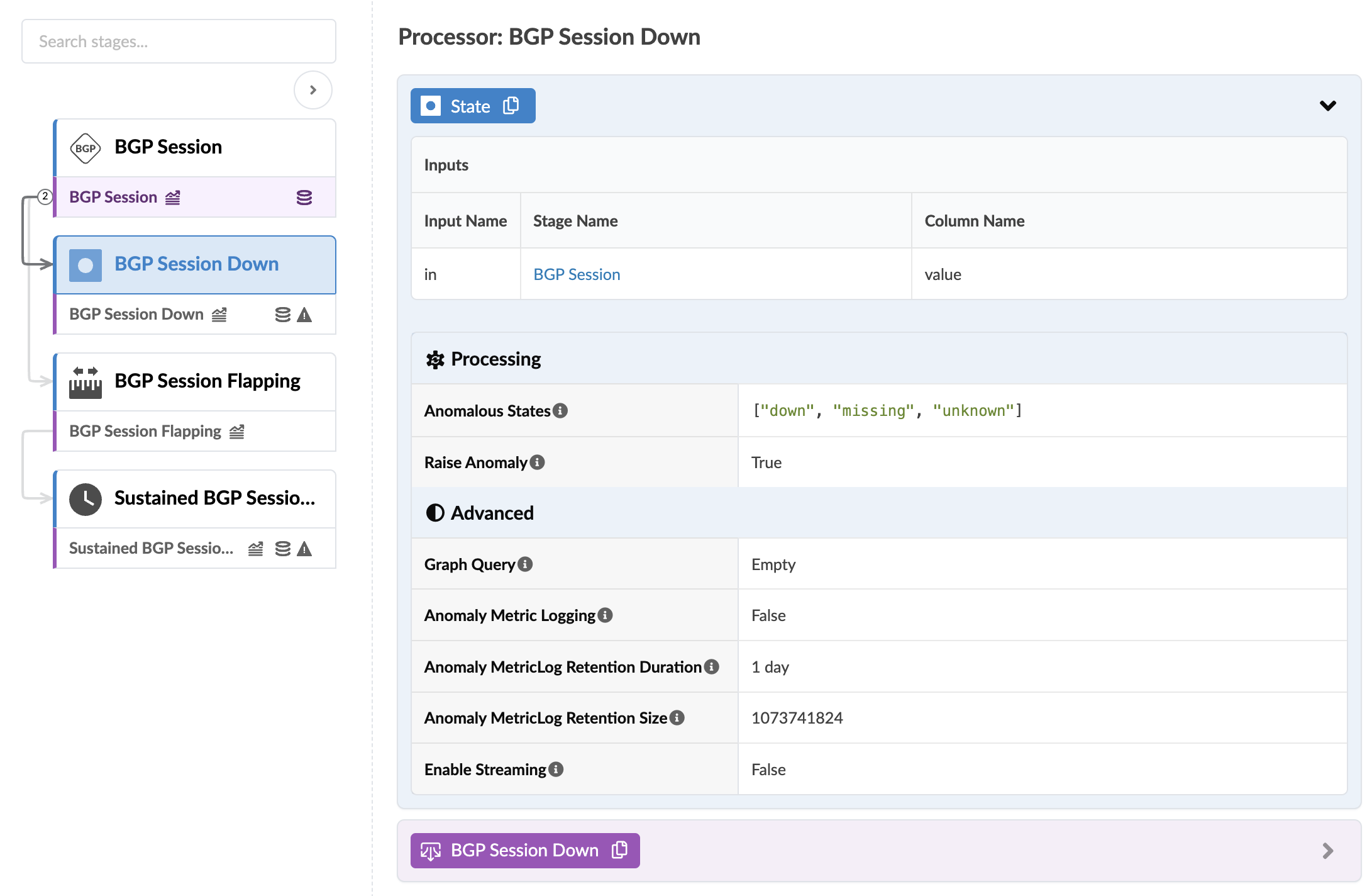 The BGP Session Down stage determines if the BGP session is not "up" and raises an anomaly accordingly. BGP Session Down is included only in Freeform blueprints. The processor includes the parameters as shown in the screenshot below: