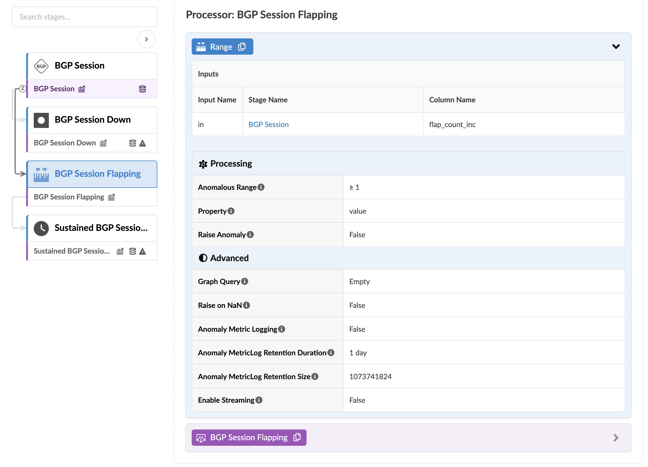 The BGP Session Flapping stage checks if the BGP session has new flaps for the last service interval period. (2 minutes by default). The BGP Session Flapping processor includes the parameters as shown in the screenshot below: