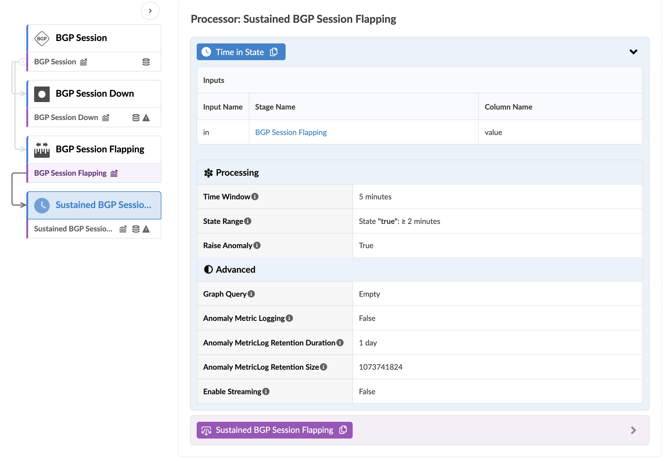The Sustained BGP Session Flapping processor includes the parameters as shown in the screenshot below: