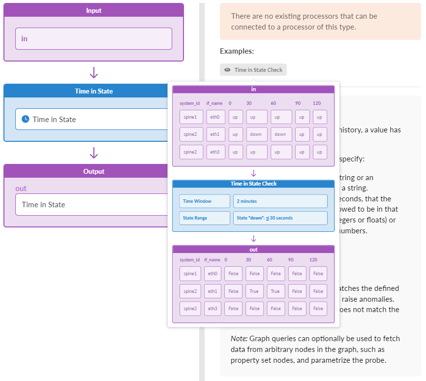 The Time in State processor measures time when a value is in the range. For each input DS, monitor it over the last time_window seconds. If at any moment, for the state in state_range, the amount of time we have been in that state over the last time_window seconds falls into a range specified in the corresponding state_range entry, we set the corresponding output DS to 'true'. Otherwise, the output DS for a given input DS is nominally 'false'. (previously called 'time_in_state_check')