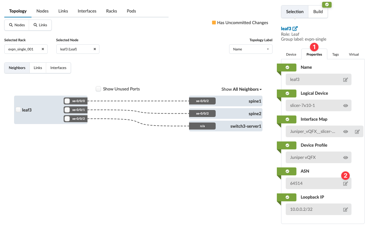 Normally, ASNs are pulled automatically from resource pools, but there may be times when you need to assign a specific ASN. In these cases, you can select the device and assign or change the ASN from the Properties tab.