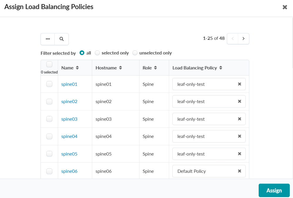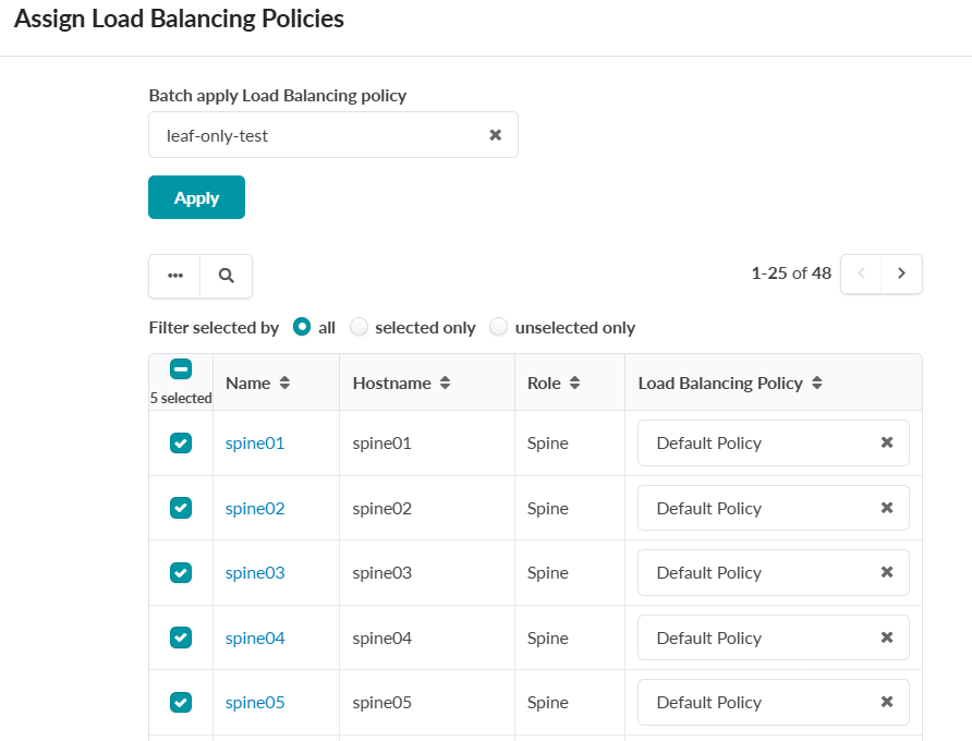 If an incompatible LB policy is assigned to the wrong device type, a warning is raised. For example, if you assign a policy with GLB in Helper Only mode to a leaf device, an error is raised stating that the assigned policy is not supported for the associated device ASIC type.