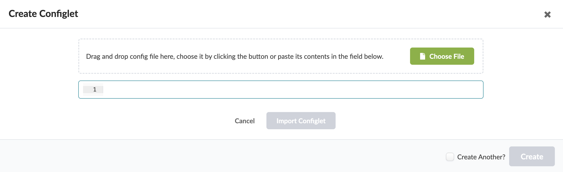 Either click Choose File and navigate to the image on your computer; or drag and drop the image from your computer into the dialog window, click Import Configlet, then click Create.