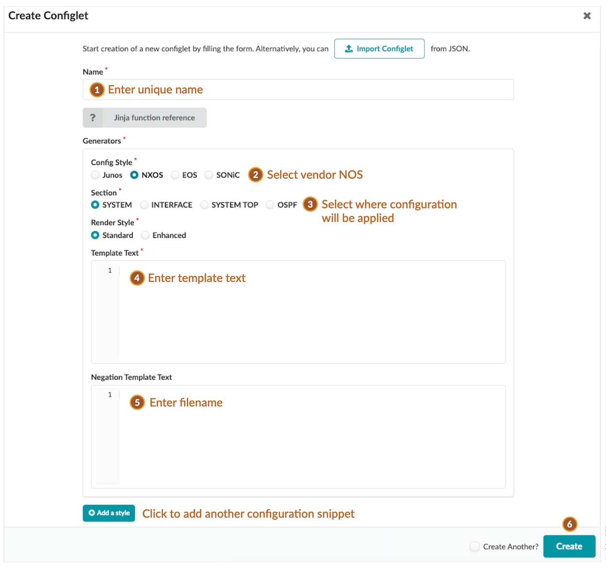- To add another generator, click Add a style and enter details. (Tip: Configlets can contain syntax for multiple vendors. Create one single-purpose configlet with a generator for each vendor NOS type to include its own syntax.)