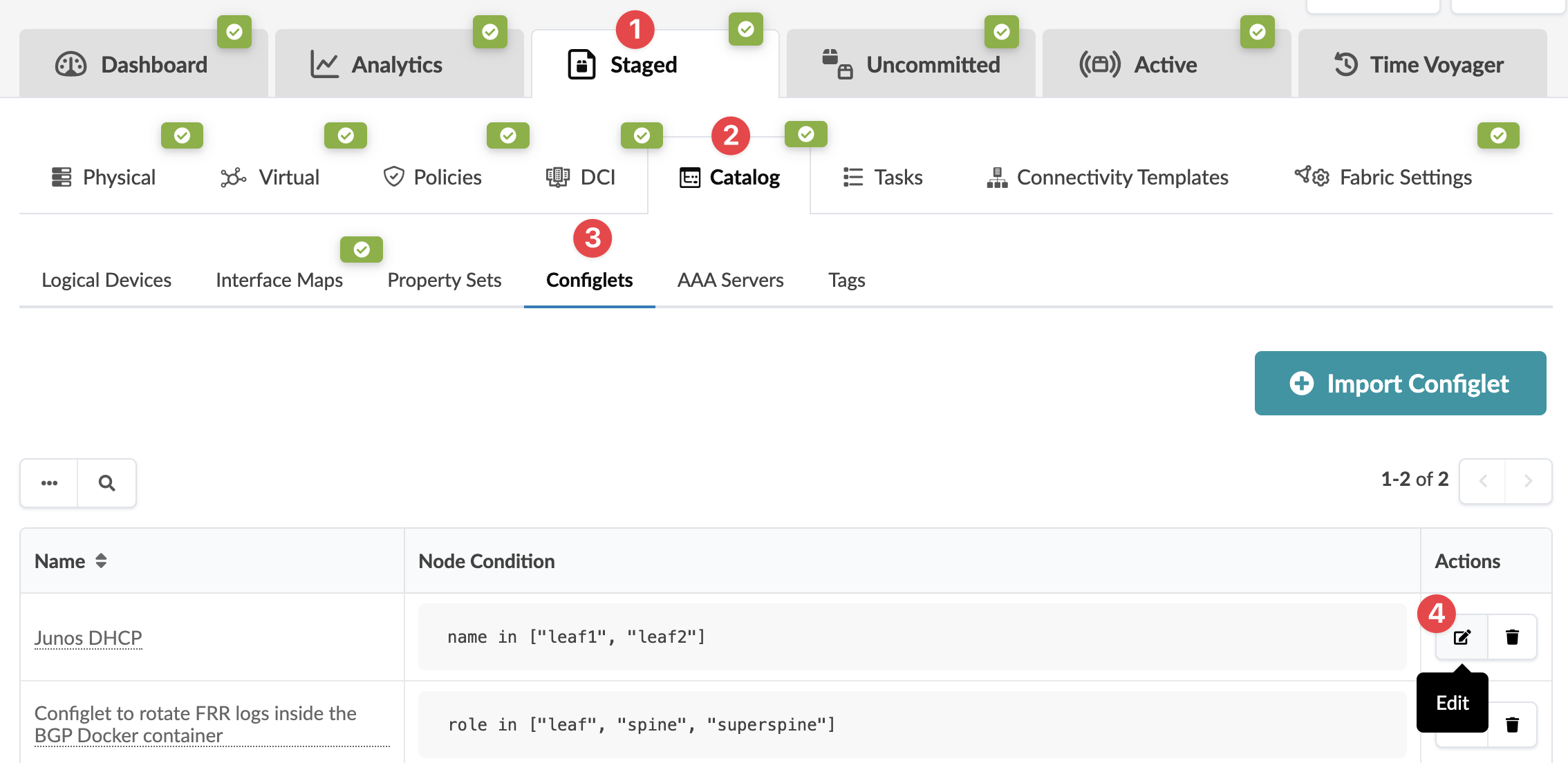 The configlet changes are staged and you're returned to the