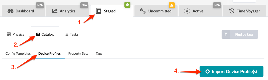 Device Profiles define the capabilities of supported hardware devices. They interact with devices via system agents. They don't include system IDs (serial numbers) which enables you to build your network in the Apstra environment 'offline' before you have your devices ready. In Freeform blueprints you import device profiles to provide context for configuring systems with config templates.