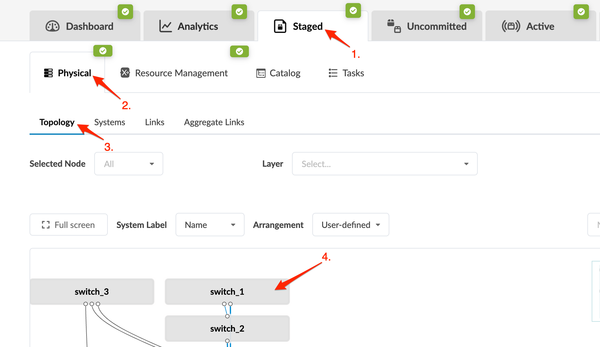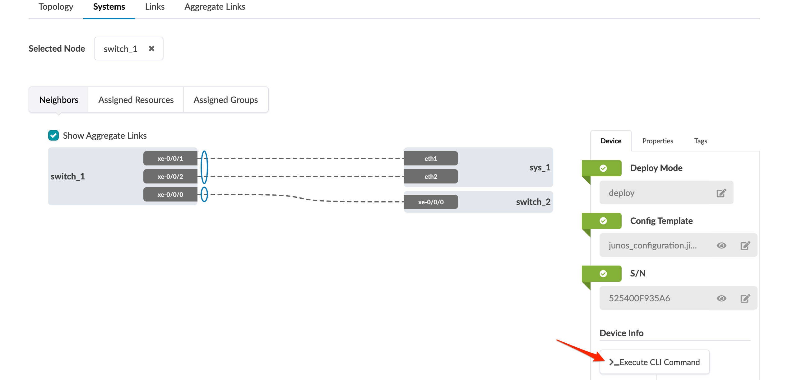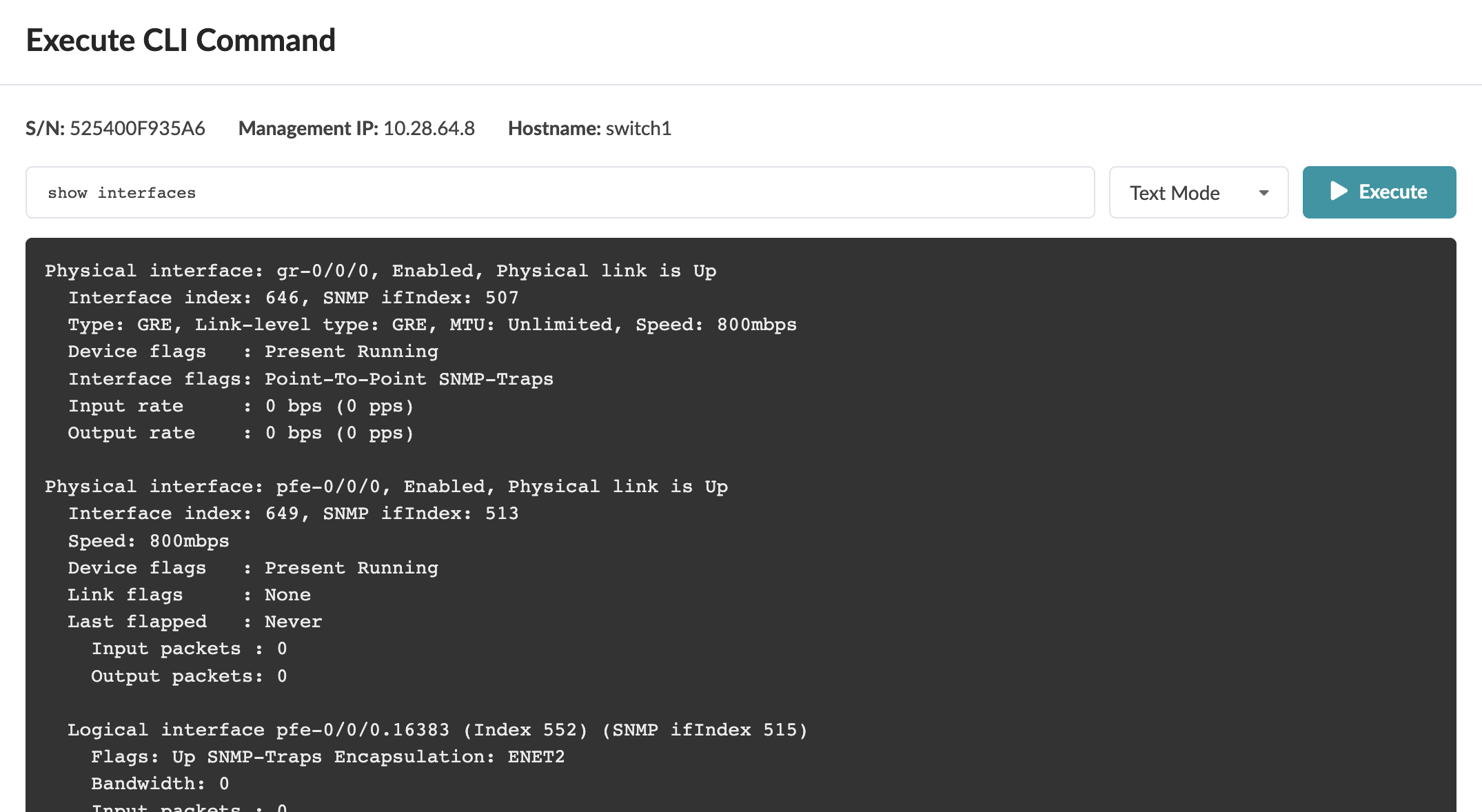 While in the Apstra environment, you may need device information that's obtained via CLI commands. Traditionally, you need to log in to a machine with access to the device management network, open a terminal, find device IP addresses, SSH to each of them, then run the required CLI commands. You can bypass these steps and run show commands for Juniper devices directly from the Apstra GUI. You can execute CLI commands from within the staged or active blueprint, or from the Managed Devices page. The steps below are for Freeform blueprints.