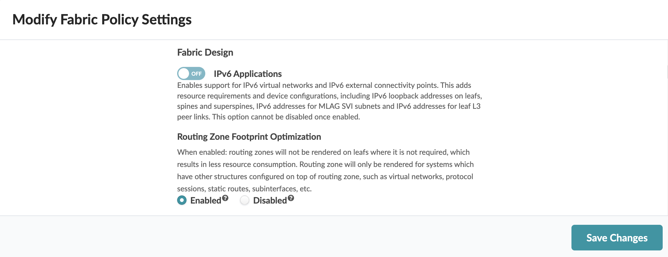 Enabling support for IPv6 virtual networks on EVPN L2 deployments or L3 deployments adds resource requirements and device configurations. This includes IPv6 loopback addresses on leaf devices and spine devices, IPv6 addresses for MLAG SVI subnets and IPv6 addresses for leaf L3 peer links. The following caveats apply: