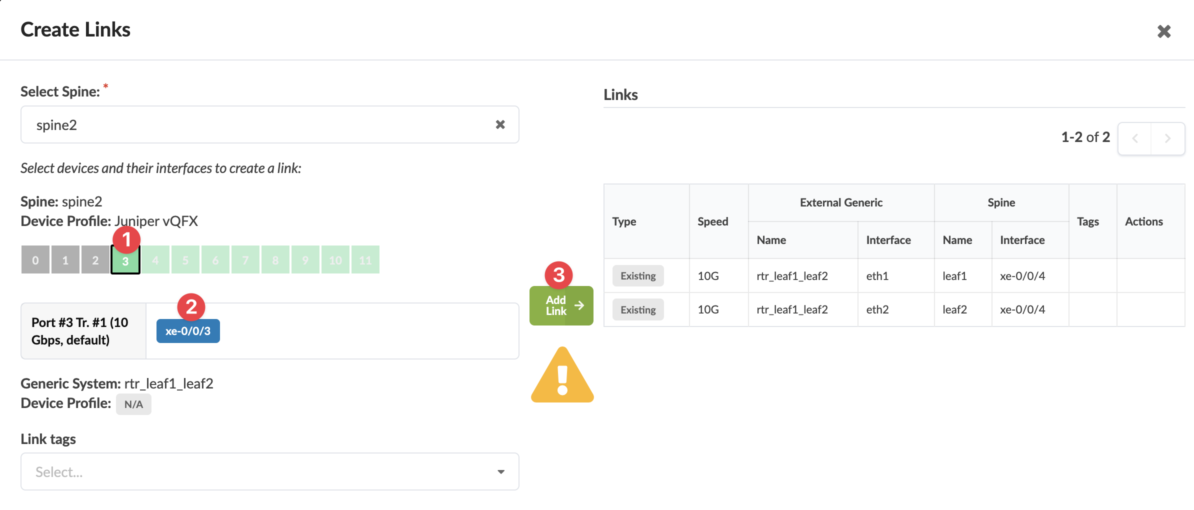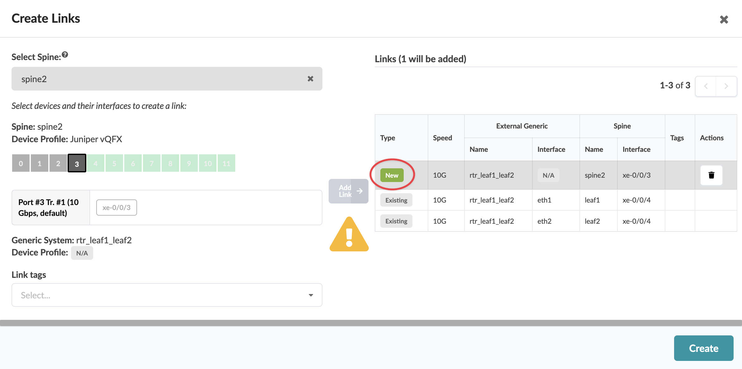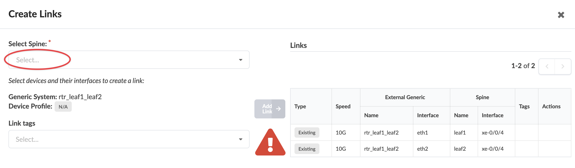 1. From the blueprint, navigate to Staged > Physical > Topology and select a node that can connect to a spine. In our example, we've selected an external generic system.