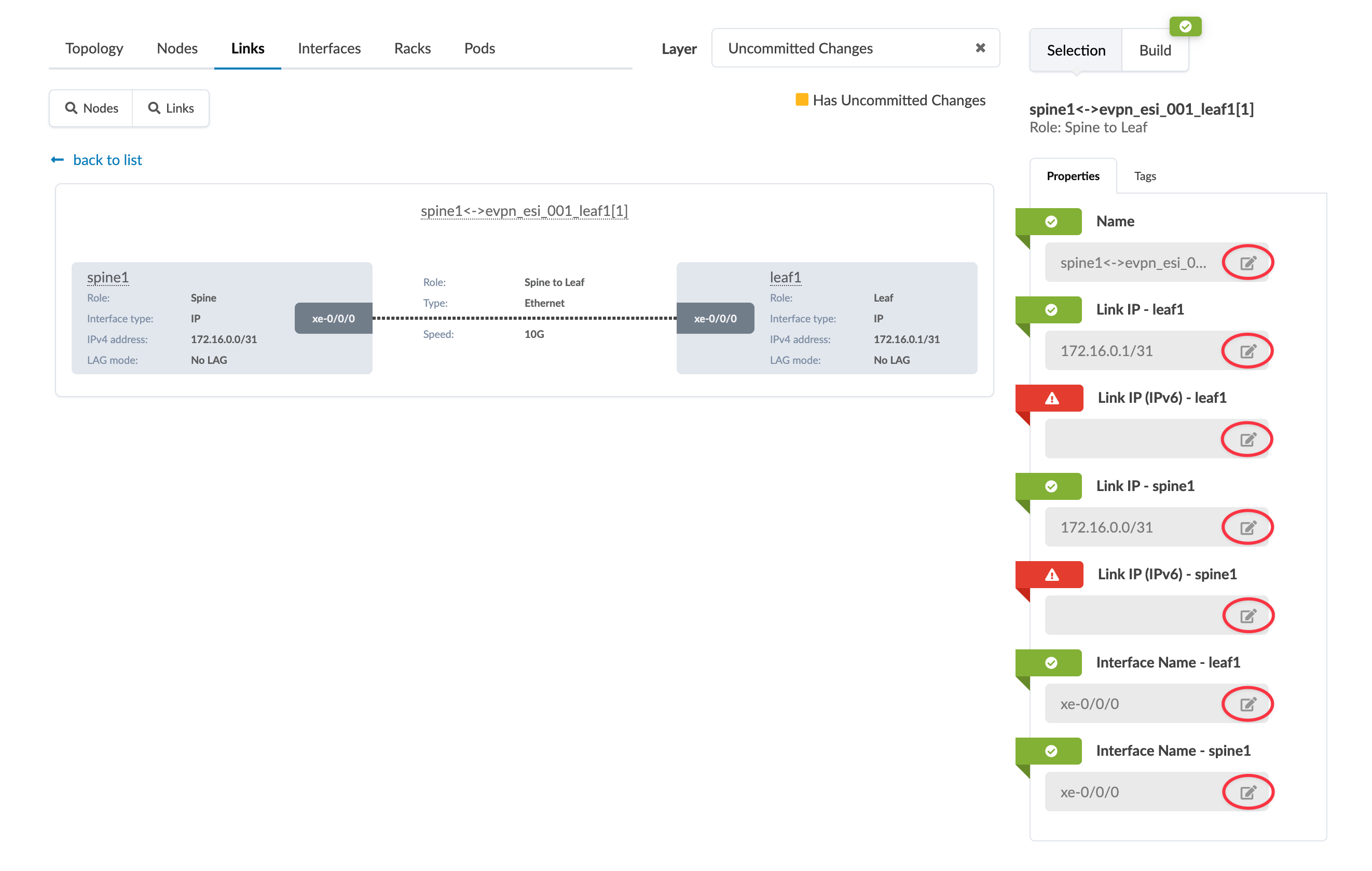 If you have changed server names and/or hostnames for switches, any associated link names do not automatically update to match. This may cause confusion when reviewing an updated cabling map in the Uncommitted tab. You can change link names to match your other name changes. You can also change link IP for endpoints from here.