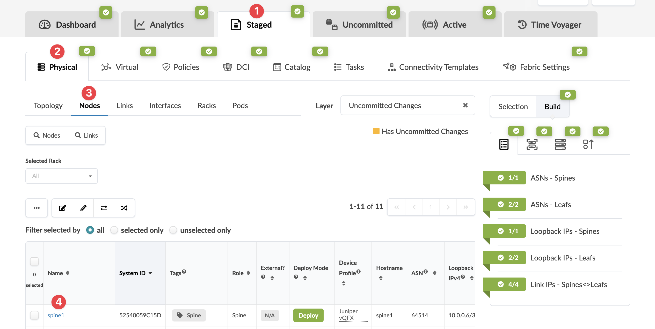 You can change device properties such as name, interface map, ASN, and loopback IP, depending on the node chosen.