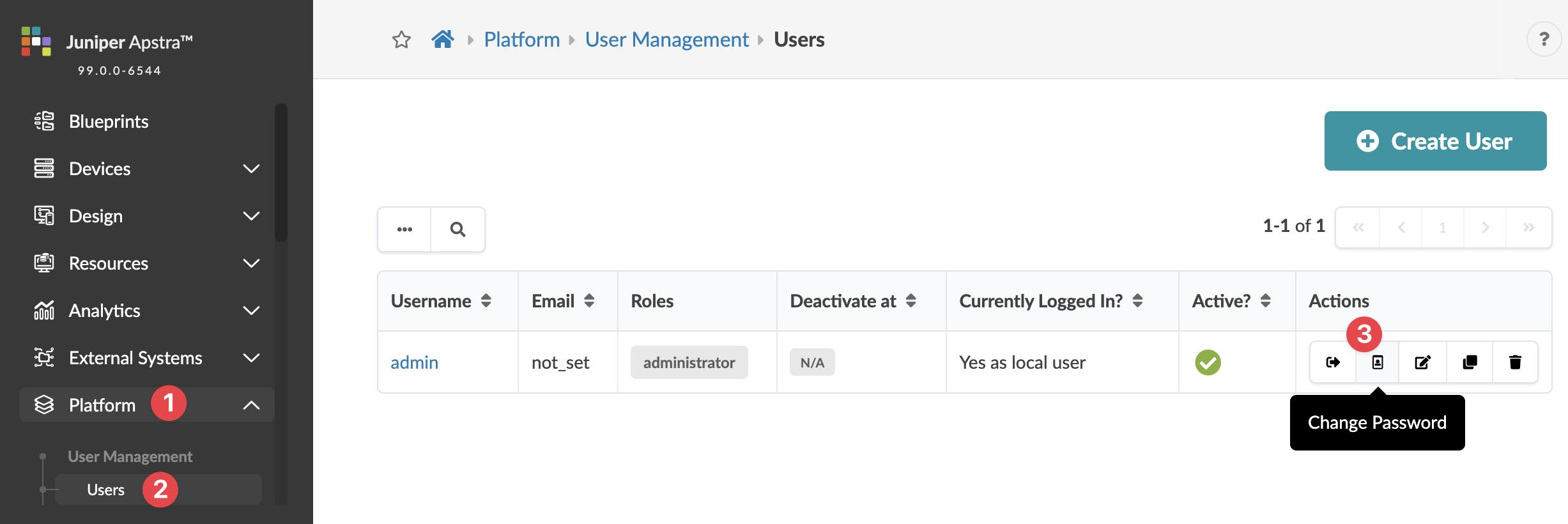 - Enter a new password that meets password complexity requirements, then re-enter the new password. (You can change password requirements from Platform > Security > Password Complexity Parameters.)